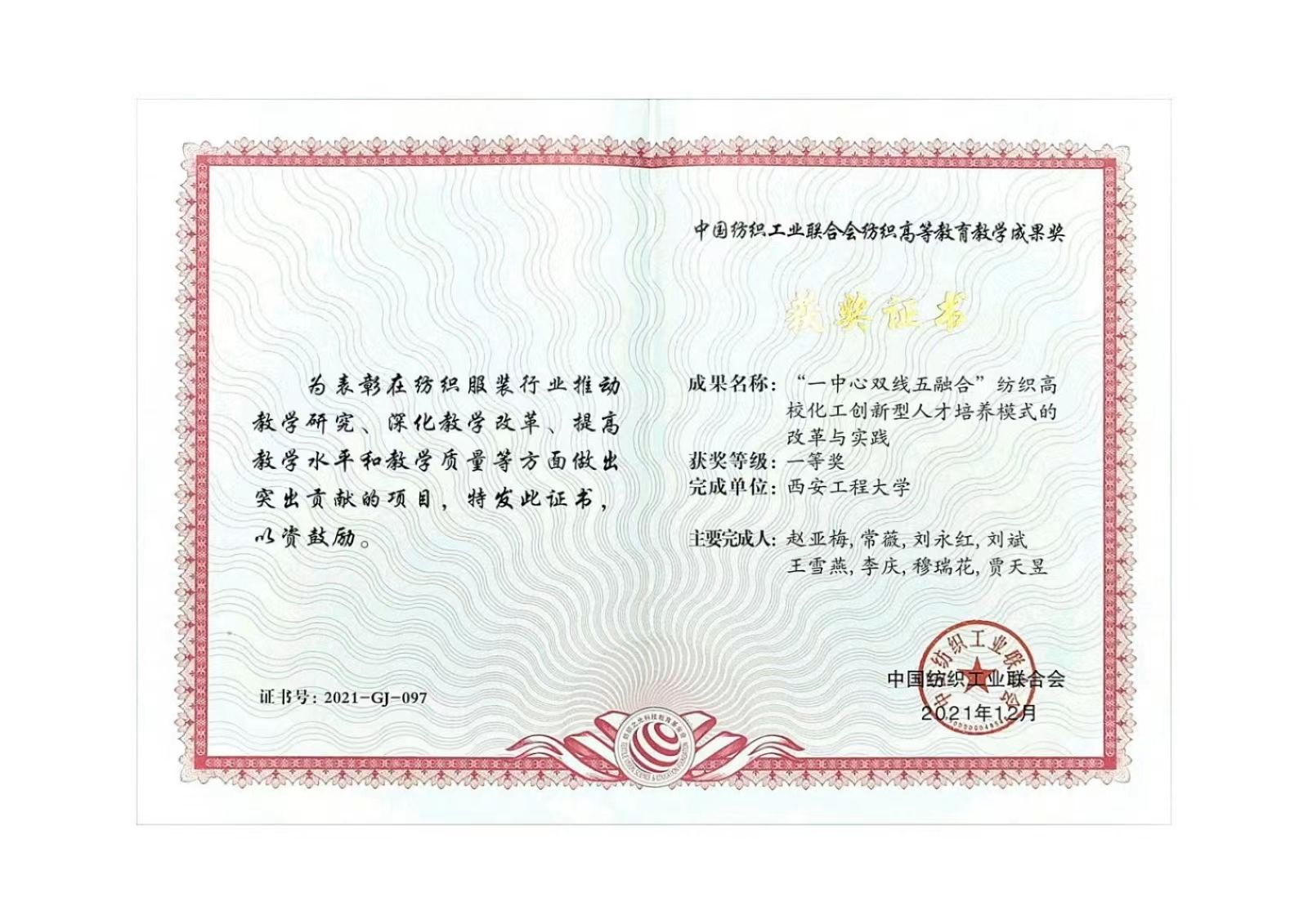 中国纺织工业联合会纺织高等教育教学成果一等奖