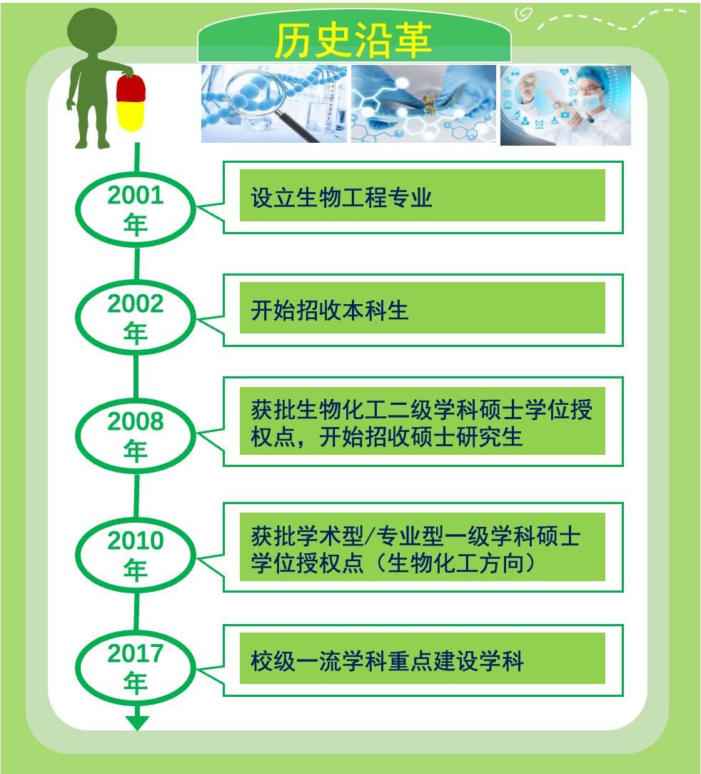 生物工程系,2002年开始连续招收本科生。2008年获批生物化工二级学科硕士学位授权点,开始招收硕士研究生。2010 年生物化工所属一级学科化学工程与技术获批一级学科硕士学位授权点。2017 年化学工程与技术学科被确定为校级重点建设学科。依托生物化工学科,拥有省级高层次研究团队2个,省级化学实验教学中心1个,省级重点实验室及工程研究中心2个,西安市重点实验室1个,教学实践基地10个。具有学士学位和硕士学位授予权,拥有从本科到研究生的人才培养体系。本专业现有省级高层次研究团队2个,国家级高层次人才1人,省市级高层次人才2人,已形成了一支年龄、学历和学缘结构合理、业务精湛、充满活力的教学团队梯队。