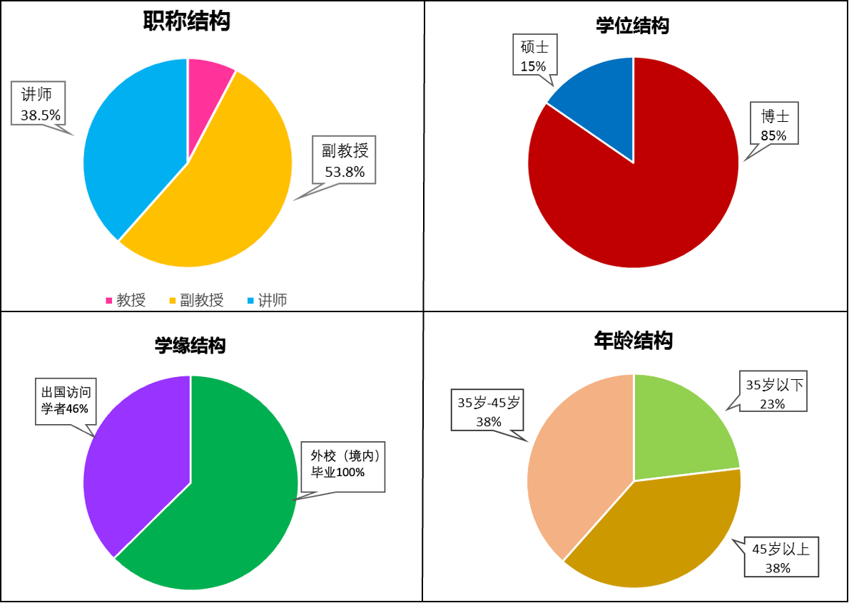 生物工程专业历来重视师资队伍建设,通过引育并举,已形成一支职称、年龄、学缘结构较为合理的师资队伍。专业现有教师13人,其中教授1人、副教授6人、高级工程师1人,讲师5人,形成了秦创原科学家+工程师队伍。师资队伍中具有博士学位的占教师总数的84.6%。有6名教师分别在美国、日本、意大利等获得学位或开展了访学研究。