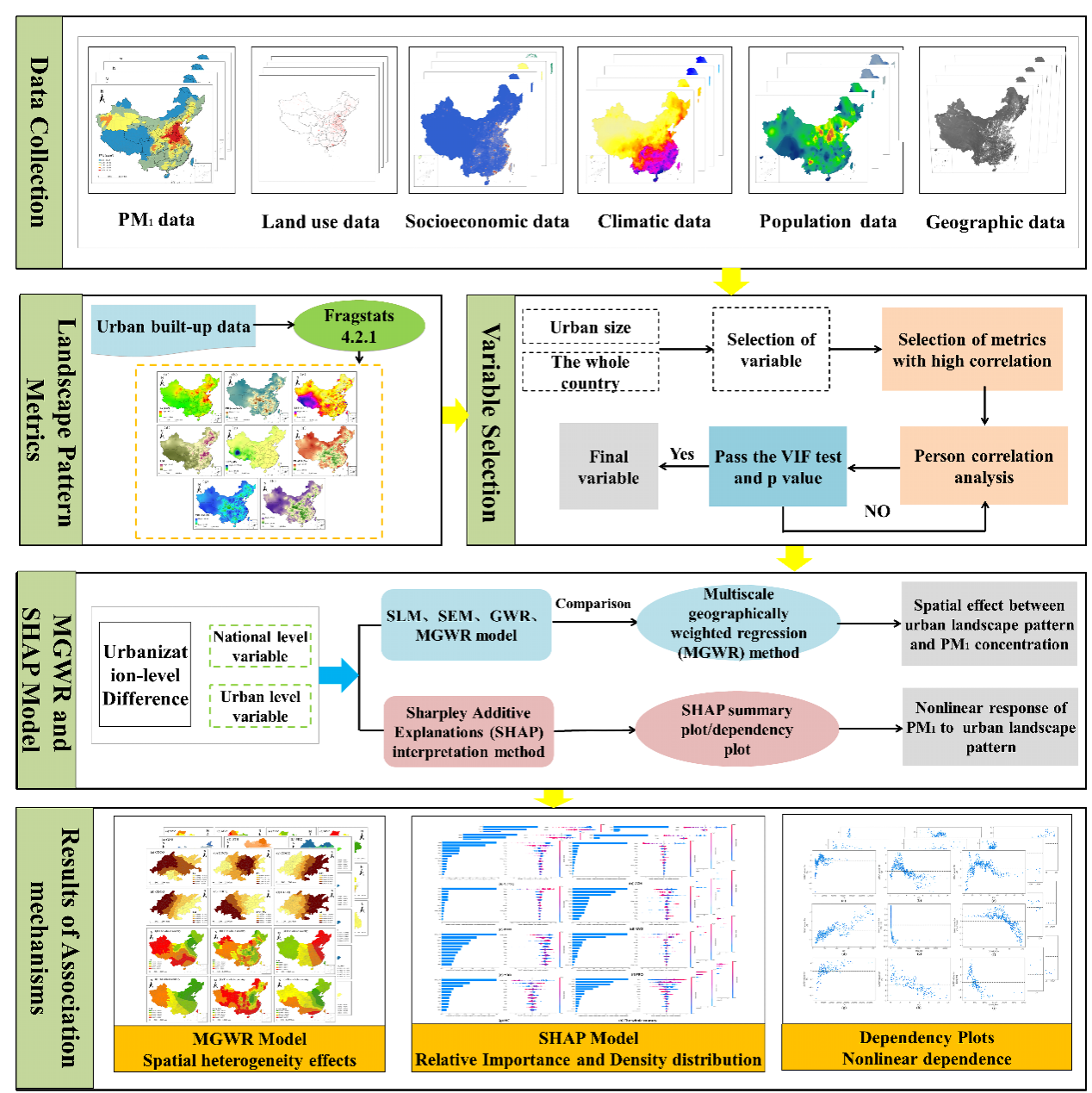 城市景观格局是大气污染物的排放源和影响因素的空间载体,对大气颗粒物(PM)污染产生影响。然而,很少有研究考虑城市景观格局对PM1浓度的空间非平稳性效应和非线性影响。本研究集成多尺度地理加权回归模型(MGWR)和Shapley加性可解释机器学习方法(SHAP),在国家与城市群尺度上探索景观格局对PM1浓度的空间异质效应、相对贡献程度和非线性依赖关系。结果表明城市景观格局与PM1污染密切相关,具有明显的空间差异。城市建成区无序扩张与不规则的城市形态将加剧PM1污染,而城市破碎化与连通性具有削减作用。分散的景观格局可以有效降低长三角(YRD)、珠三角(PRD)和成渝(CDCQ)地区的PM1浓度,而紧凑且连续的景观指数对缓解京津冀(BTH)和关中平原(GZH)城市群的PM1污染具有积极作用。城市景观格局与PM1污染之间的关系在城市群中体现更强烈。ENN_MN是特征重要性最强和可解释程度最大的景观指数。与其他景观指数相比,城市形状指标与PM1浓度之间的阈值效应关系更复杂。这些关键知识为深入理解PM1污染与景观格局之间的关联机制、城市可持续规划和大气污染调控提供科学依据。该成果以“Investigating the multiscale associations between urban landscape patterns and PM1pollution in China using a new combined framework”为题,发表于Journal of Cleaner Production(2024,456,142306)期刊上,论文第一作者为GimyTV