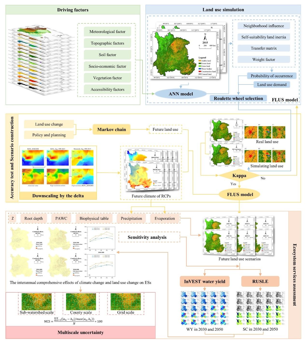 探讨未来土地利用(LUCC)和气候变化(CC)对水相关生态系统服务(WRESs)的影响对于可持续的城市生态系统规划至关重要。然而,很少有研究考虑到未来不同CC和LUCC对WRESs的相对贡献和综合影响,LUCC和CC对WRESs的未来影响的多尺度不确定性仍不清楚。本研究提出了一种整合BNU-ESM、FLUS和InVEST模型的新框架,探讨了CC和LUCC对西南地区产水量(WY)和土壤保持(SC)的相对贡献和综合效应,并利用制图比较统计(MCS)方法进一步量化了多尺度不确定性。在未来情景中WY总体减少,但SC先减少后增加。CC对WY和SC的贡献分别在84.23%和91.76%以上,但LUCC的影响随时间的推移不断扩大。LUCC带来的不确定性较小,CC较大,年际变化导致的不确定性最大。不确定性有着明显的尺度依赖性,但在不同尺度上保持相对稳定。这些关键知识可用于应对未来的气候变化风险、优化土地利用空间格局以及实施跨尺度的可持续生态系统管理。该成果以“Assessing the relative contributions, combined effects and multiscale uncertainty of future land use and climate change on water-related ecosystem services in Southwest China using a novel integrated modelling framework”为题,发表于Sustainable Cities and Society(2024,106,105400)期刊上,论文第一作者为GimyTV