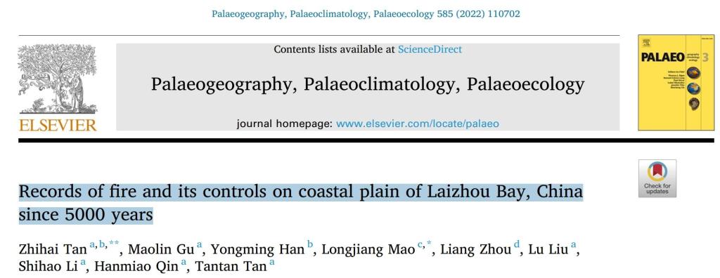 、中科院黄土与第四纪地质国家重点实验室谭志海副教授团队在国际地学领域的Top期刊“Palaeogeography, Palaeoclimatology, Palaeoecology”(《古地理、古气候、古生态》,2022年影响因子:3.565,SCI一区)上发表了题为“Records of fire and its controls on coastal plain of Laizhou Bay, China since 5000 years”(距今5000年以来中国莱州湾沿海平原火历史及其主控因素)的最新研究。