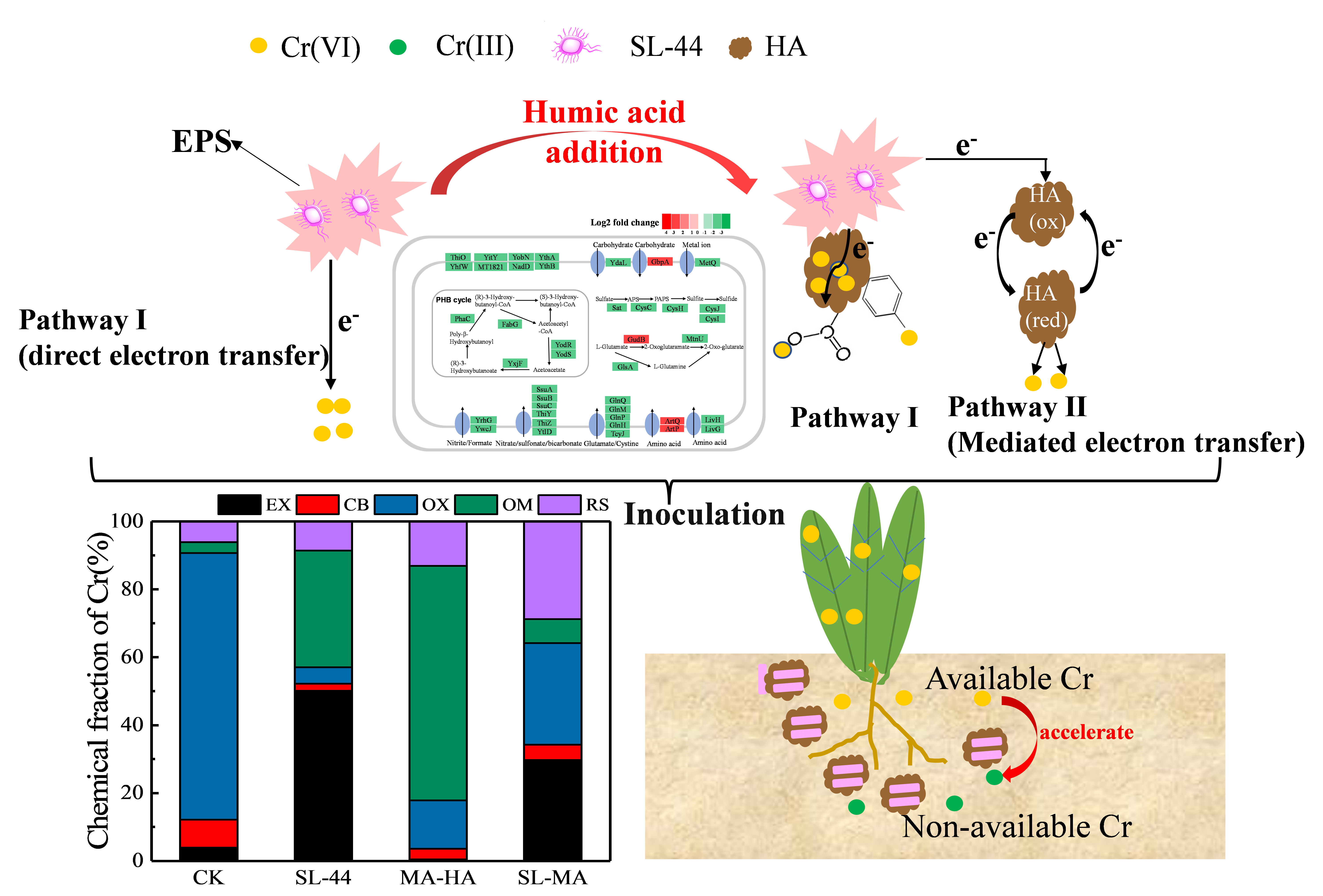 枯草芽孢杆菌具有优良的抗逆性,其不仅可以促进植物生长、抑制土壤病菌生长,还可以改善土壤结构,还常被用作修复剂来降低水和土壤中重金属的移动性和植物有效性。但由于Cr(VI)对微生物生理活性、遗传物质稳定性的危害,需要对细菌加入特定的保护剂。腐殖酸作为一种生物相容性良好的多官能团有机大分子,其可以作为微生物保护剂和重金属离子螯合剂。因此,为了解析腐殖酸保护剂在枯草芽孢杆菌SL-44还原铬过程中所扮演的角色,本研究通过经验拟一阶动力学、对数变换的紫外-可见差分吸收光谱、激发发射荧光光谱耦合平行因子分析两种腐殖酸(AL-HA和MA-HA)对Cr(VI)的非生物还原、金属络合容量。阐明了MA-HA展示出较高的还原速率常数和络合稳定常数,MA-HA更高的电子交换容量(EEC)可以增强细菌-腐殖酸复合物(SL-MA)的电容并降低电化学阻抗,以推动中价态Cr(V)的生成并增强Cr(VI)还原率。揭示了MA-HA可缓解Cr(VI)对SL-44的生理毒性,展示出细菌胞外分泌物中谷胱甘肽含量的显著降低以及涉及氨基酸转运蛋白、谷氨酸代谢、多羟基丁酸(PHB)水解相关基因的下调。腐殖酸协同枯草芽孢杆菌剂应用能使白菜中铬富集量显著降低71.0%。