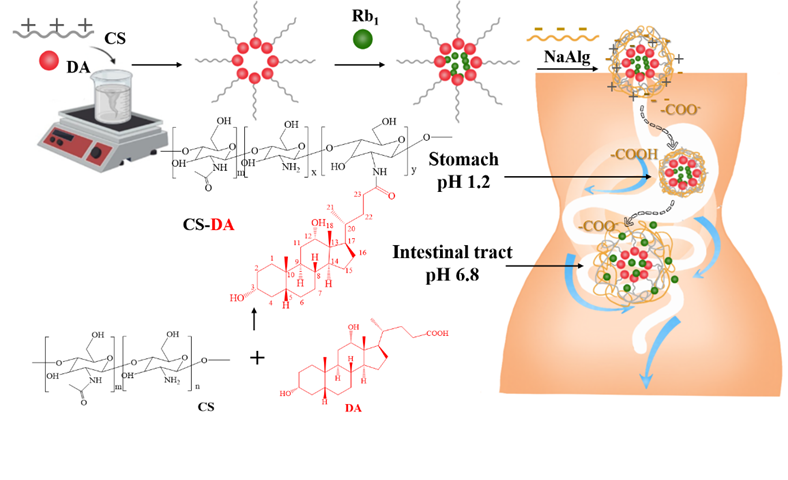 人参皂苷在预防和抑制肿瘤方面具有重要作用,但由于其较差的水溶性、靶向性和生物利用度,使得人参皂苷在临床上的应用被限制。将纳米技术应用于医学领域,开发针对癌症肿瘤的抗癌药物输送新型载体,能够解决药物溶解度低导致的生物利用度低、降解导致的肠道吸收机制差、靶向传递机制不足等问题。研究中采用脱氧胆酸对壳聚糖进行疏水改性,合成壳聚糖-脱氧胆酸聚合物,并将其与海藻酸钠进行交联反应,制备对胃肠道 pH 敏感的负载人参皂苷 Rb1 的壳聚糖-脱氧胆酸/海藻酸钠纳米粒子。研究发现此纳米粒子对人参皂苷 Rb1包封率高,在模拟胃肠液中具有较好的缓释性能。此外,纳米粒子显著的pH敏感性能够在模拟胃液中保护被负载的Rb1,避免其快速释放,而在模拟肠液中具有较高的累计释放率,实现纳米粒子在口服过程中对人参皂苷Rb1的可控释放。研究结果表明了海藻酸钠浓度参数对纳米粒子制备技术及释放性能的影响,同时对纳米粒子的释放机制进行了阐明,所制纳米粒子能够满足作为口服药物载体的条件,为难溶性药物口服载体的应用提供了理论依据。
