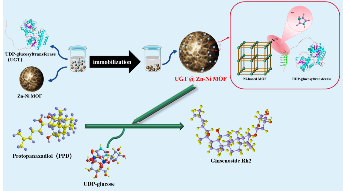 传统的固定化酶方法都存在一些缺陷,例如:酶在催化过程中容易脱落;使用交联剂会导致酶活性丧失;需要高纯度的酶,这大大增加了固定化过程的难度和成本。而利用过渡金属离子与His标签酶上的咪唑基团之间的金属螯合作用,实现酶在金属有机框架(MOF)中的特异性固定化,为解决这些难题提供了一种前景广阔的方案。这种创新方法不仅提高了酶的稳定性和重复使用性,还实现了酶的一步纯化和固定化,有效避免了从粗酶溶液中纯化酶的需要,从而大大节省了实验成本。在催化反应中使用固定化酶对提高人参皂苷Rh2的转化率具有巨大潜力。该研究制备的Zn-Ni MOF材料可作为带有His标签酶的一步纯化和固定化平台,为糖基转移酶在稀有人参皂苷Rh2催化转化中的实际应用提供了新的思路。
