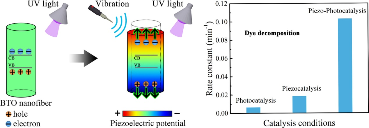 本工作中,通过水热法合成了钛酸钡纳米纤维材料,并研究了其压催化与光催化的协同效应。协同催化、压催化、光催化降解罗丹明B染料溶液的一阶化学催化反应速率常数分别为~0.10307 min−1, ~0.01859 min−1和~0.00641 min−1。在双催化协同效应中,催化中间产物活性自由基的数量显著提高。研究发现相对于单一的光催化或者压催化,该双催化协同对其他染料如MB、,MO、AO7等也表现出显著提高的染料降解效果。该工作为未来同时收集环境中的振动能和光能用于纺织印染废水处理提供了科学参考。
