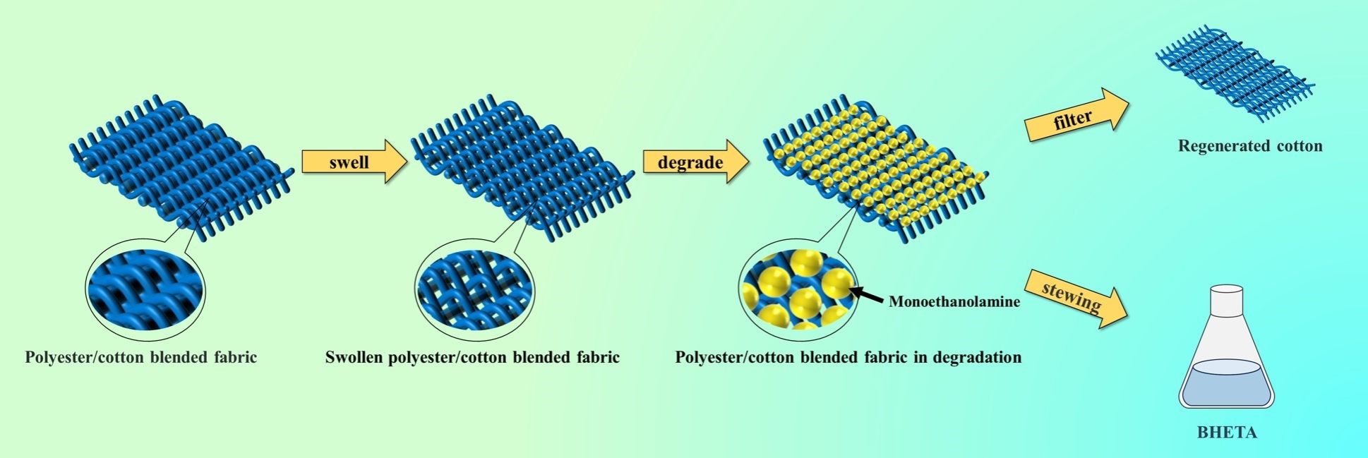 此项工作中,利用更加绿色环保、条件温和、节约资源的“溶涤保棉技术”方法降解废旧涤棉混纺织物中的涤纶,实现对废旧涤棉混纺织物的高值化利用。首先创新性地提出“溶胀预处理”策略,经预处理后,涤纶解聚率能够大幅提升,降低了后续的反应条件。使用乙醇胺试剂,在常压无催化剂条件下对涤棉混纺织物进行回收,并对回收产物通过多种表征手段分析发现,再生棉纤维的化学结构、晶体结构与原生棉相近;涤纶解聚产物双(2-羟乙基)对苯二甲酰胺(BHETA)含量较高。该研究提出了一种对废旧涤棉混纺织物更简单的回收方法,实现了废弃涤棉混纺织物的高附加值利用,对经济、生态和环境保护意义重大。