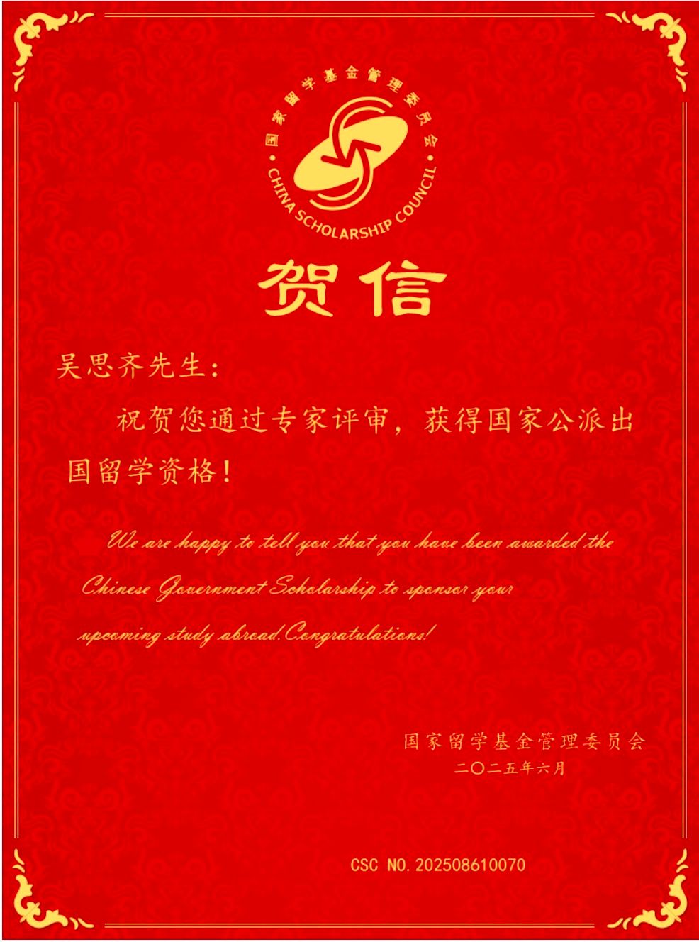 吴思齐同学成功入选该项目,是其个人不懈努力的结果,也得益于学院长期以来对研究生培养质量的高度重视和对国际化发展战略的持续推进。学院始终坚持以人才培养为核心,不断深化教育教学改革,优化研究生培养体系。国家公派留学项目作为学院重点支持的国际化人才培养平台,为研究生提供了宝贵的海外深造机会。未来学院将继续深化拓展国际合作与交流,为更多有志学子搭建通往国际学术前沿及成果应用的桥梁,争取更多优质资源,通过中外联合实验室和创新实践基地等平台,助力培养具有全球视野和国际竞争力的拔尖创新人才。