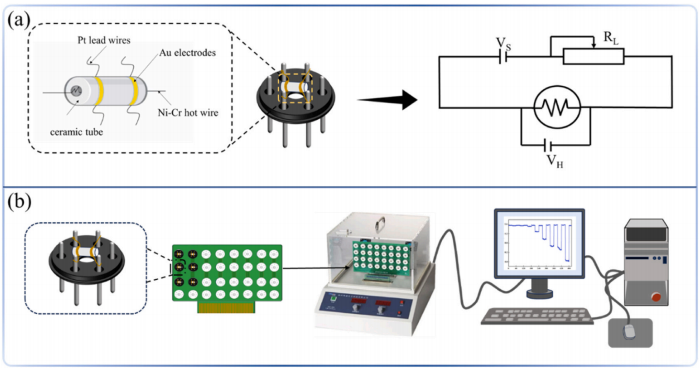 图1 (a)气体敏感元件示意图,(b)气体敏感性测试流程图。