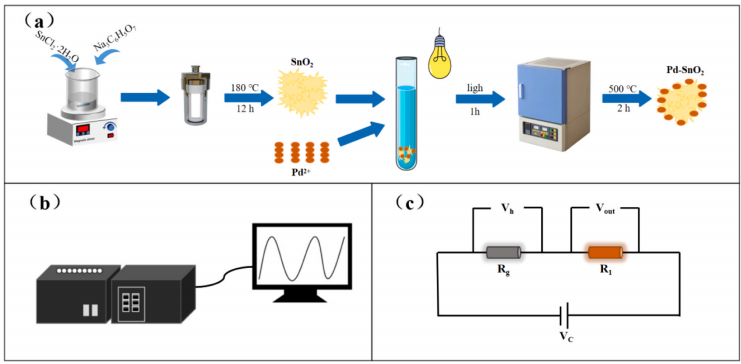 图2 (a) Pd-SnO2纳米片组装成花状结构的示意图,(b)气体测试装置,(c)气体敏感测试电路系统。