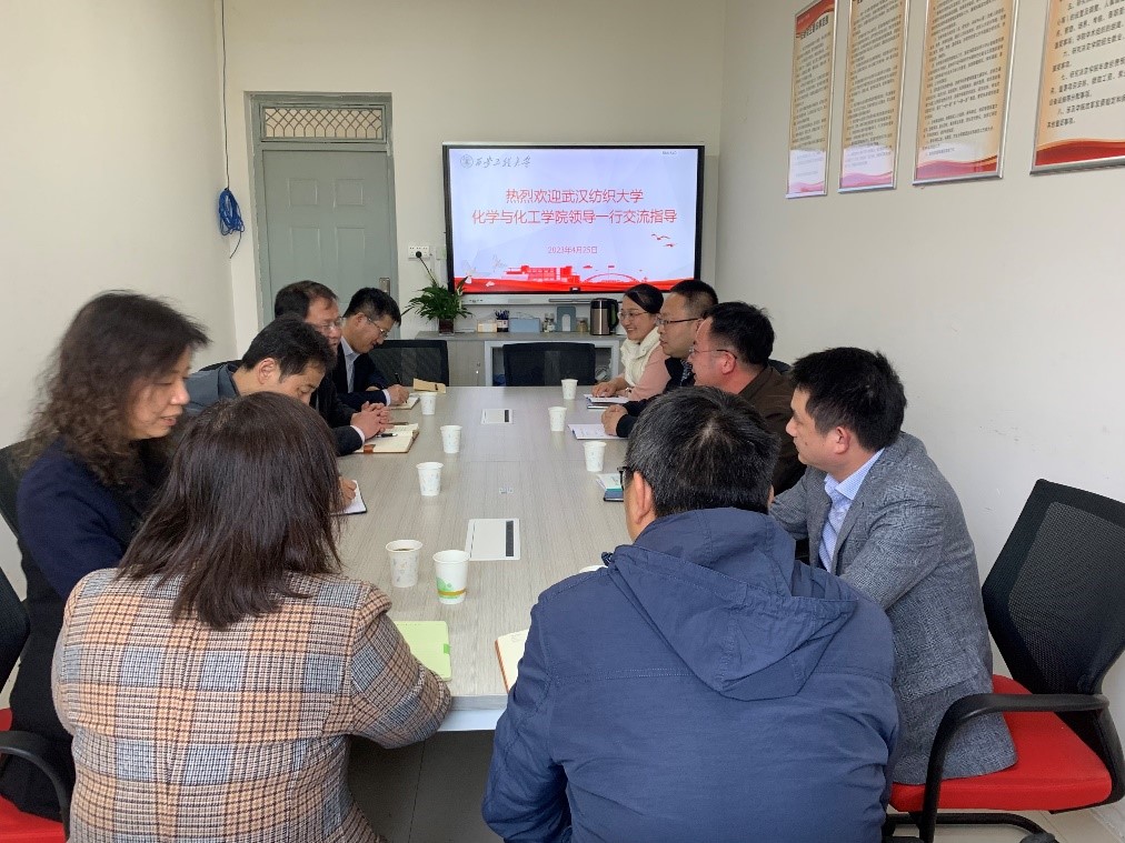 座谈中,张洛红院长代表学院对朱君江院长一行表示热烈欢迎。他就学院历史沿革、师资队伍、学科发展、专业建设、人才培养等情况做了介绍。党委书记胡西民就党建如何支撑学院发展工作做了介绍,并期望在交流中双方能够畅所欲言、互学互进。朱君江院长对学院的用心安排和接待表示感谢,并介绍了武汉纺织大学化学与化工学院的专业设置、招生就业、学科平台、科研成效等工作情况。他表示,两个学院具有相似的建院背景,期待能在以后的工作中加强联系沟通,互通有无。