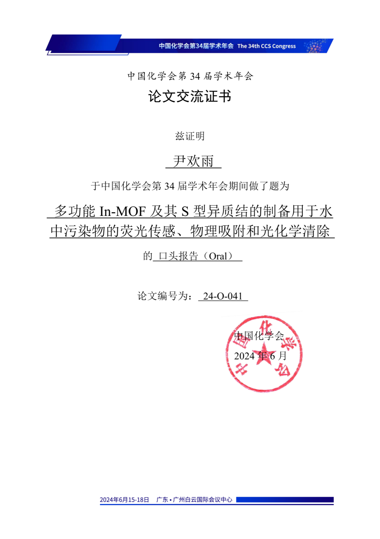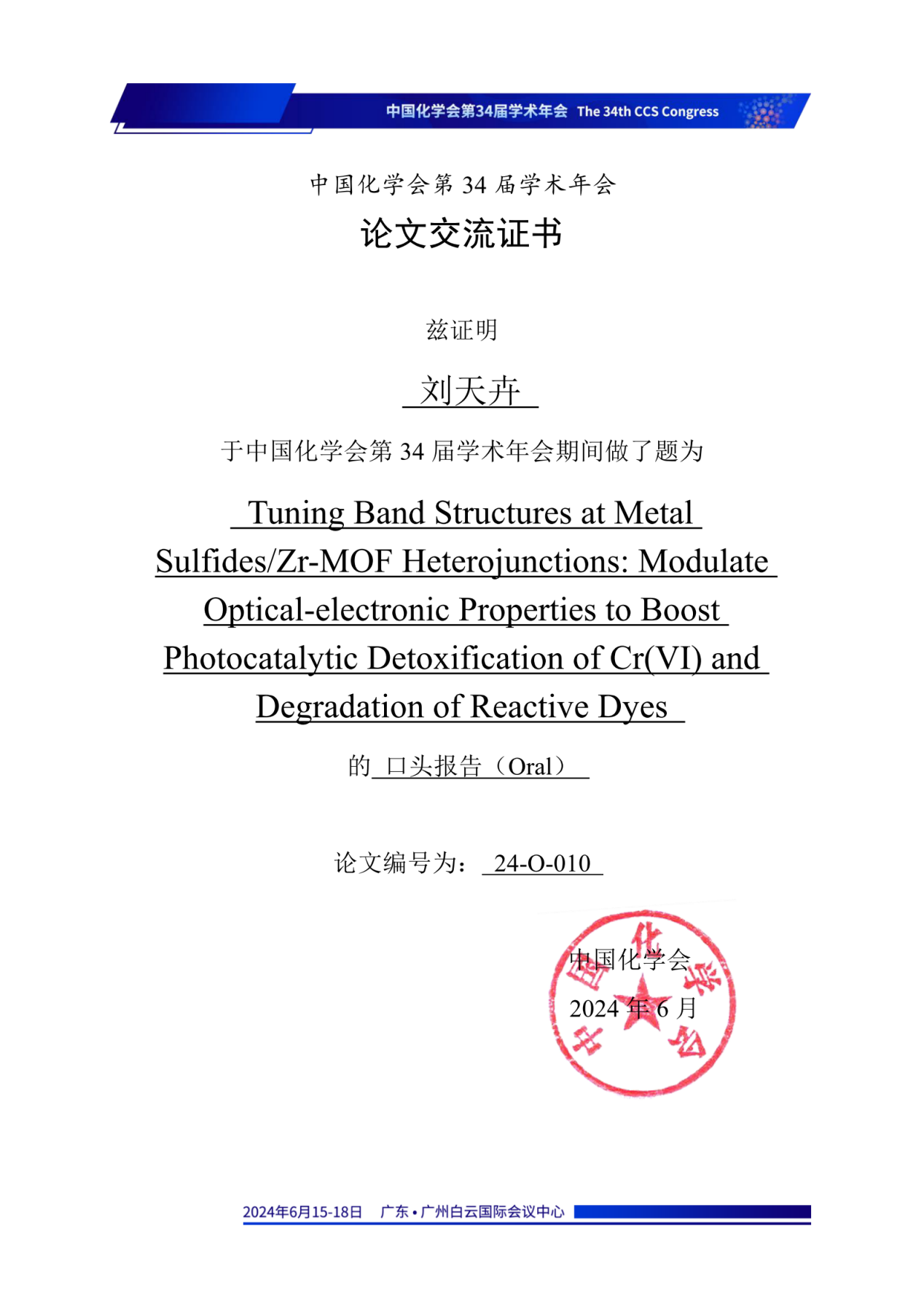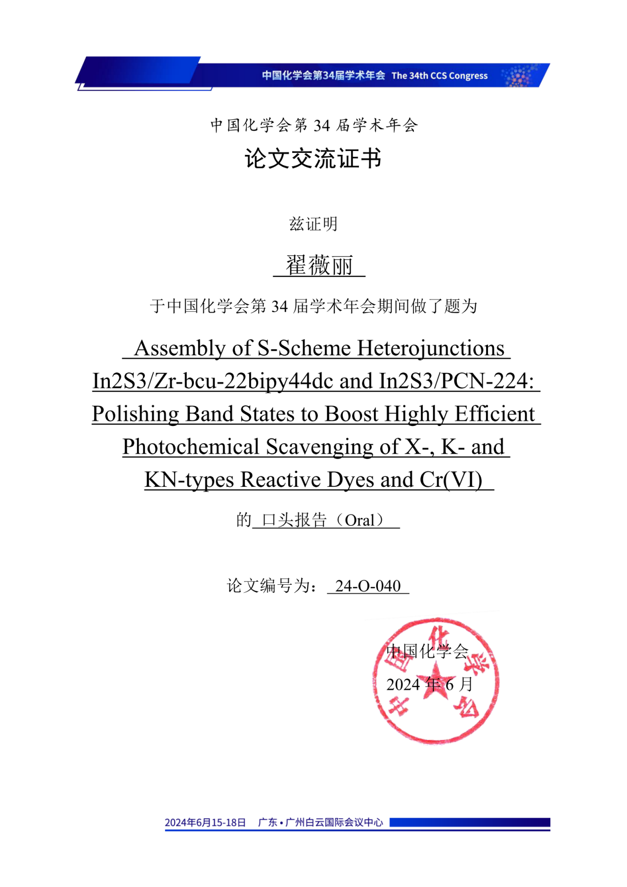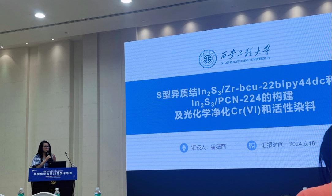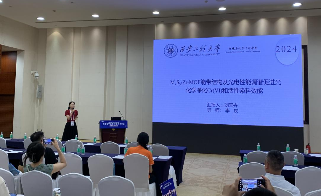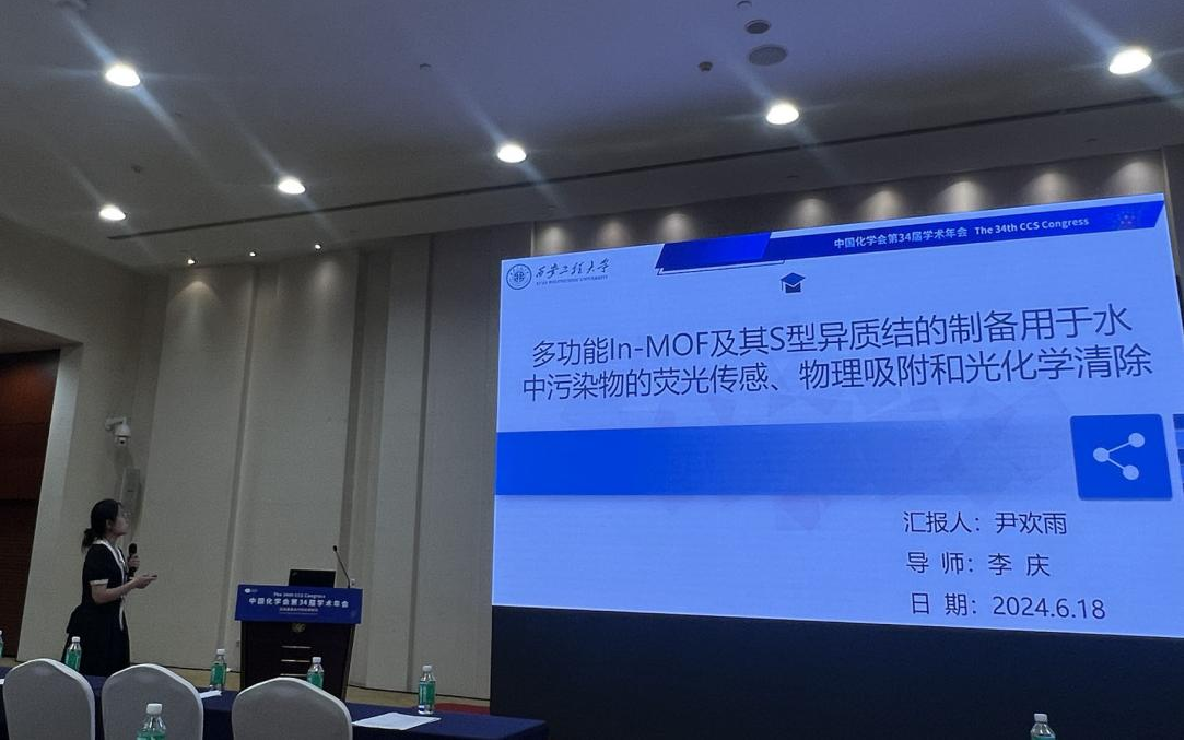 李庆老师指导的2023级博士研究生翟薇丽,2021级硕士研究生刘天卉、尹欢雨参会,在第二十四分会(功能晶态材料)做口头学术报告,报告题目分别为:“Assembly of S-Scheme Heterojunctions In2S3/Zr-bcu-22bipy44dc and In2S3/PCN-224: Polishing Band States to Boost Highly Efficient Photochemical Scavenging of X-, K- and KN-types Reactive Dyes and Cr(VI)”(翟薇丽)、“Tuning Band Structures at Metal Sulfides/Zr-MOF Heterojunctions:Modulate Optical-electronic Properties to Boost Photocatalytic Detoxification of Cr(VI) and Degradation of Reactive Dyes”(刘天卉)及“多功能In-MOF及其S型异质结的制备用于水中污染物的荧光传感、物理吸附和光化学清除”(尹欢雨),分享了课题组在新型MOFs基水处理材料研发,以及对纺织印染废水中常见重金属离子的荧光传感检测、有机及无机污染物的光化学清除方面的研究进展,并同与会专家学者进行了交流和讨论,展示了我校化学工程与技术、纺织科学与工程学科在相关研究领域的学术研究水平。