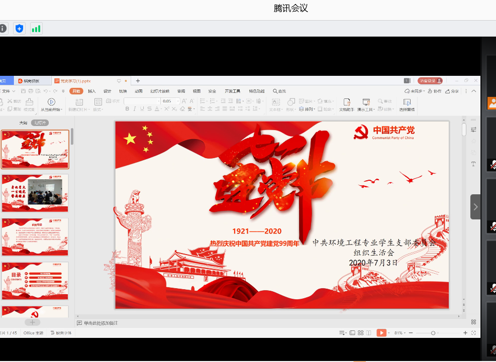 为庆祝中国共产党成立99周年,增强支部党员对党的政治认同、思想认同和情感认同,不断继承和发扬党的革命传统和优良作风,环境工程专业学生党支部于2020年7月3日下午19时召开了学习党史主题教育组织生活会。党支部全体成员参加,支部书记邵瑞华老师主持了会议。