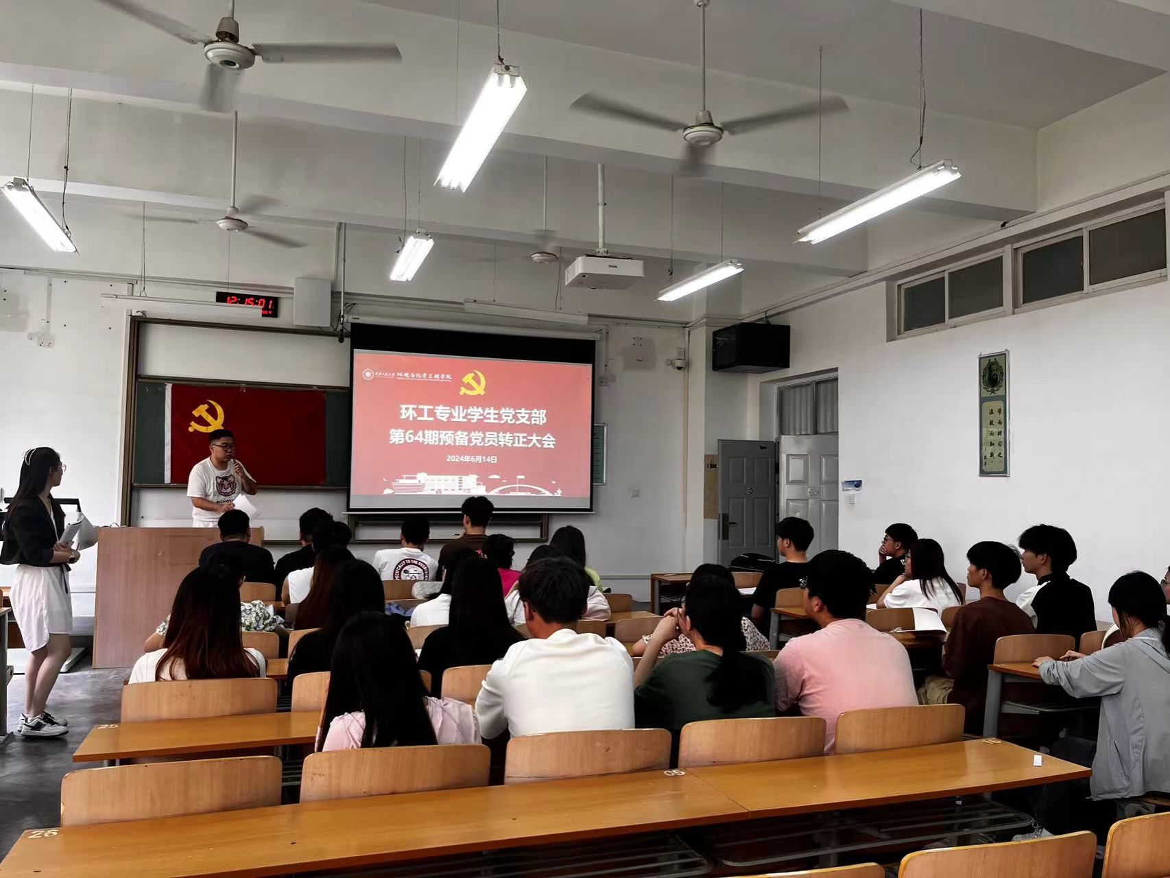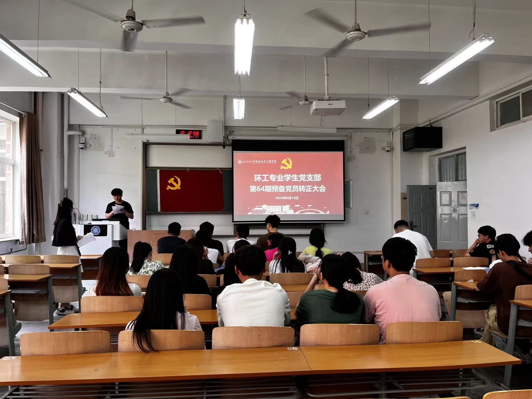 环工专业学生党支部于6月14日在A座教学楼112教室召开第64期预备党员转正大会,会议内容主要是接收屈嘉鑫等8名同志的转正事宜。会议由支部书记任子瑜主持,支部全体党员参加会议。
