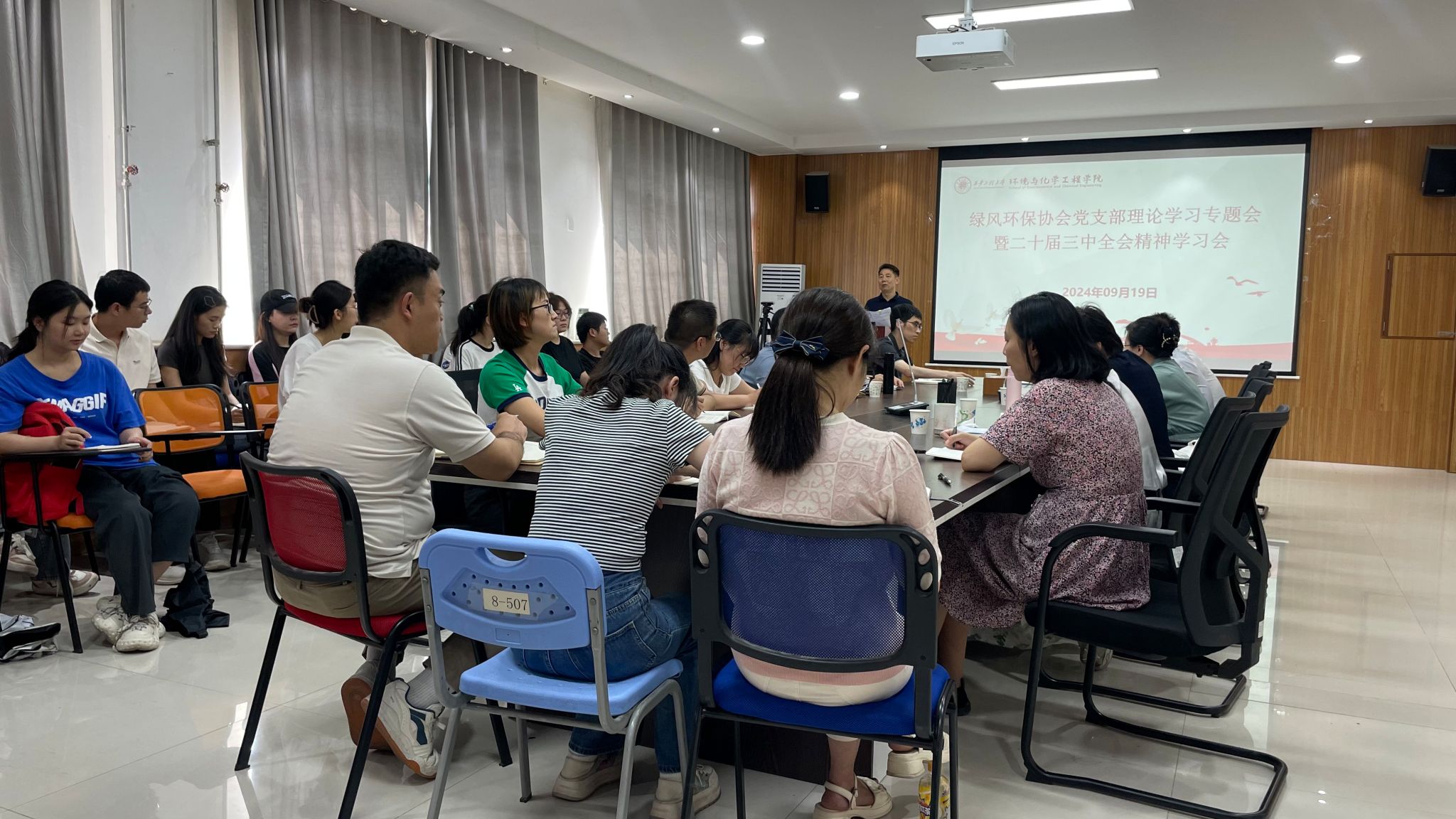 9月19日下午,绿风环保协会党支部召开专题学习会,进一步深入学习贯彻党的二十届三中全会精神。学院党委书记胡西民、绿风党支部书记武占省以及支部全体成员参加本次会议。