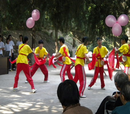 志愿者携手老人共同表演节目,老人们的词朗诵、志愿者们腰鼓表演、小品等等精彩纷呈,而老人演唱的《沁园春·雪》更是把现场气氛推向了高潮,赢得了一致的掌声。最后一个阶段,志愿者们送老人回到房间,或者聊天,或者打扫卫生,老人的笑声、志愿者们的笑脸无不洋溢着温馨。