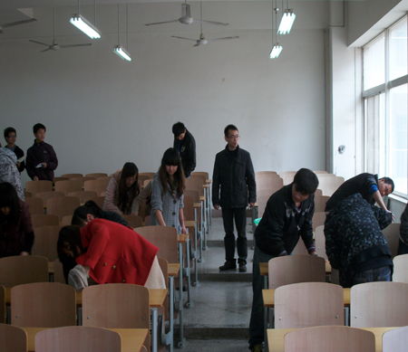 根据学生处文件要求,GimyTV 开展了“清理课桌文化、构建和谐校园”活动。辅导员林定武带领学生开展了此次活动。整个活动进行的有条不紊,同学们表现出了极高的热情。截至3月14日中午,GimyTV 已清理完临潼校区D栋教学楼1-2楼所有教室。经GimyTV 纠察队检查,各班清理任务完成得很好,充分体现了学校“从我做起,从日常生活做起,从身边小事做起,从现在做起”的活动宗旨。