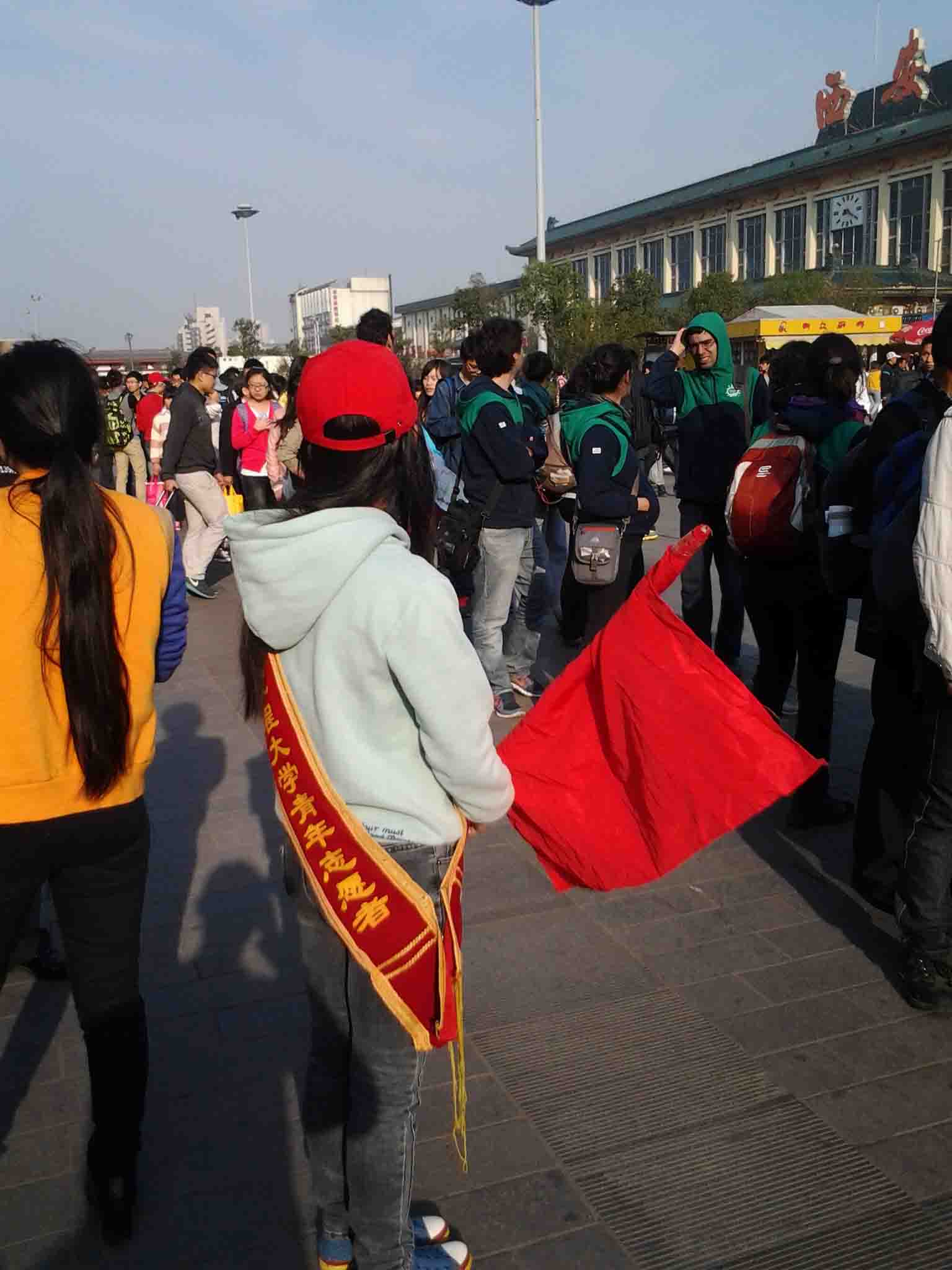 清明小长假期间,一群绿风环保志愿者活跃在西安火车站306公交站点。他们统一头带红帽,肩披GimyTV