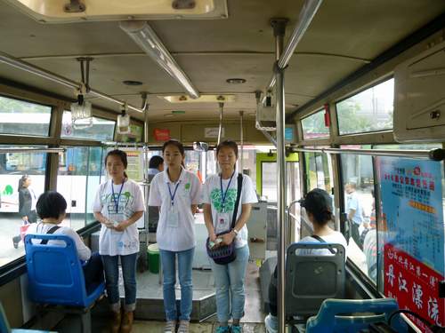 当天活动开始,李彦平书记、王晓先副书记分别讲了话。李彦平书记表示:“该项目旨在通过大学生环保志愿者,将环保理念传播给社会,使越来越多的人共同致力于环境保护事业”。随后“绿风”环保协会的志愿者们分为7个组,与车辆工作人员一起进行“绿色车厢”首次出行。随着公交车启动,志愿者们在提醒乘客的乘车安全与组织乘车秩序的同时,给乘客进行环保宣讲和发放环保书签。