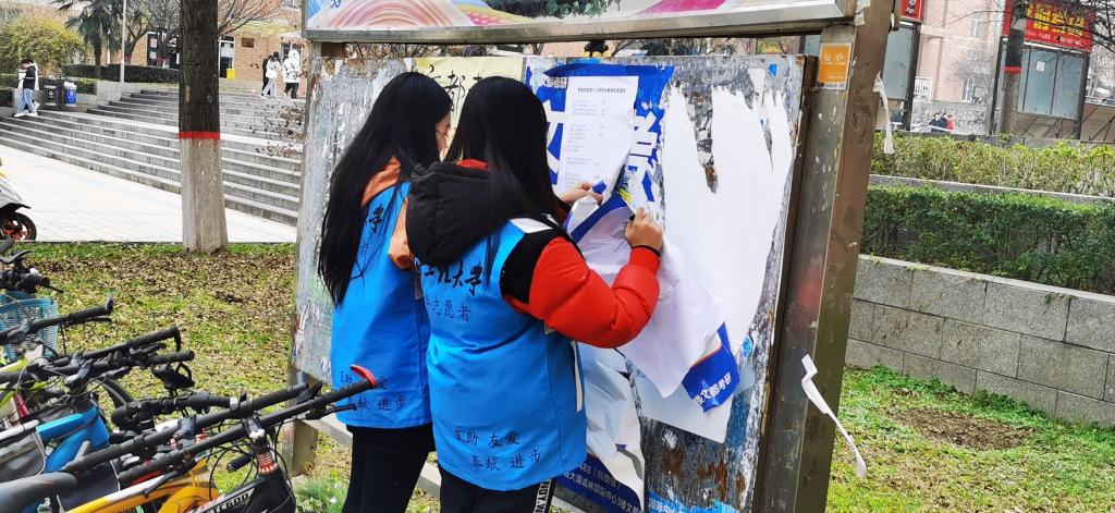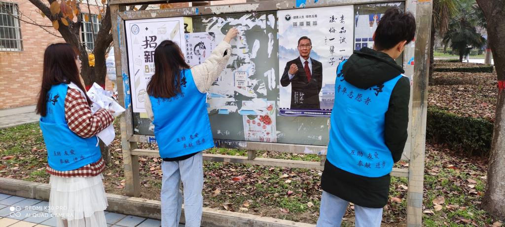 青分队带领19、20级志愿者进行义务清理宣传栏活动。