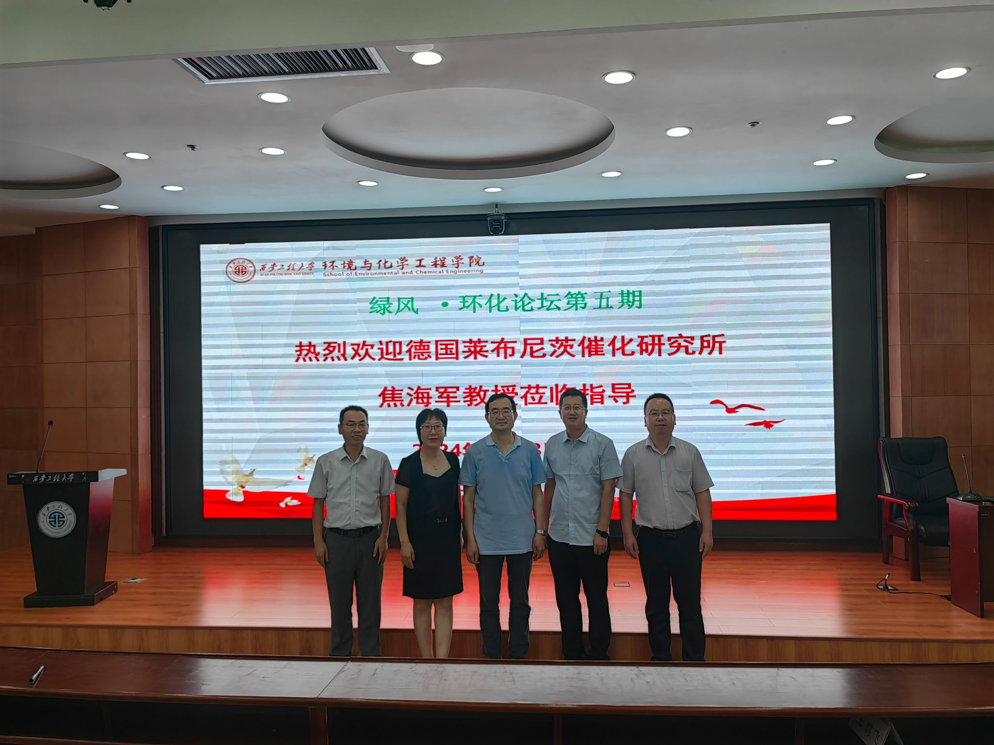 第五期绿风环化论坛报告会在临潼校区图书馆一楼报告厅举行,会议邀请德国莱布尼茨催化研究所焦海军教授作了题为《Interplay between Theory and Experiment in Pincer Complexes Catalyzed Hydrogenation, Dehydrogenation, and Transfer Hydrogenation Reactions》的学术报告,学院主持工作副院长武占省、党委副书记林定武、环工系主任李茹、化工系副教授李扬、部分教师、研究生、本科生近200人参加了报告会。会议由学院院长助理武峥主持。