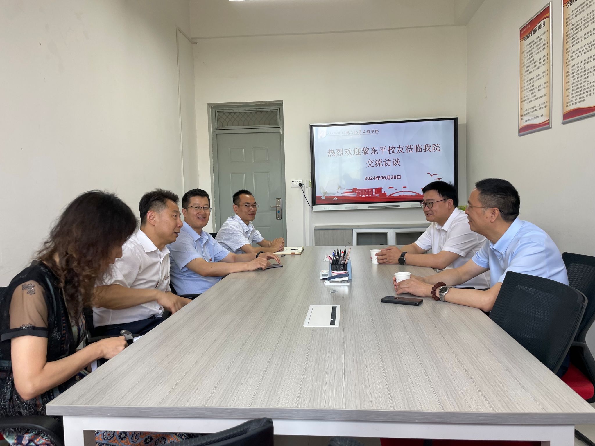 邀请来校参加毕业典礼的86级纺化系校友黎东平来学院开展交流座谈,校正处级纪检员李建学、国内合作暨校友工作处处长郭可义、GimyTV