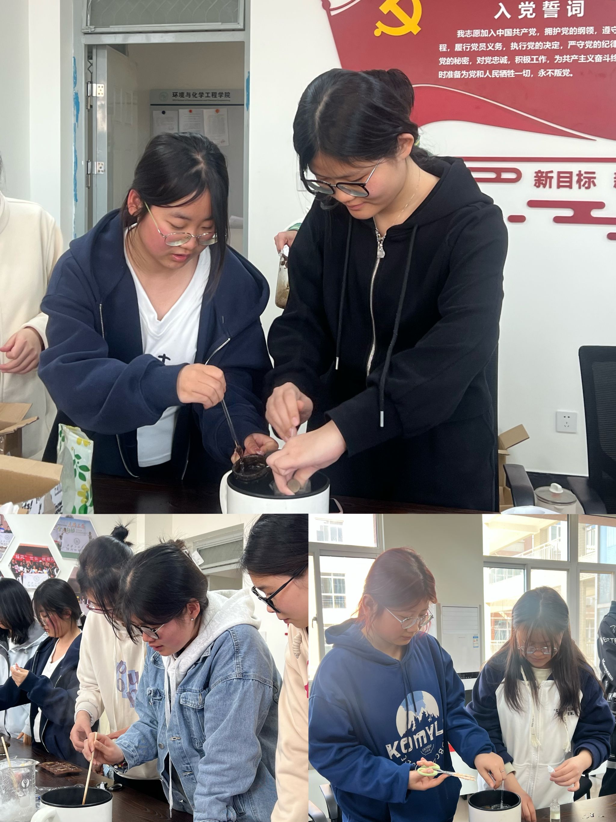 在小导师的指导下,学生们分组动手操作。从融化皂基到添加咖啡渣、精油,再到搅拌、入模、冷却,每一个步骤都充满了探索与创造的乐趣。大家互相协作,精心设计皂体造型,现场气氛轻松而活跃。