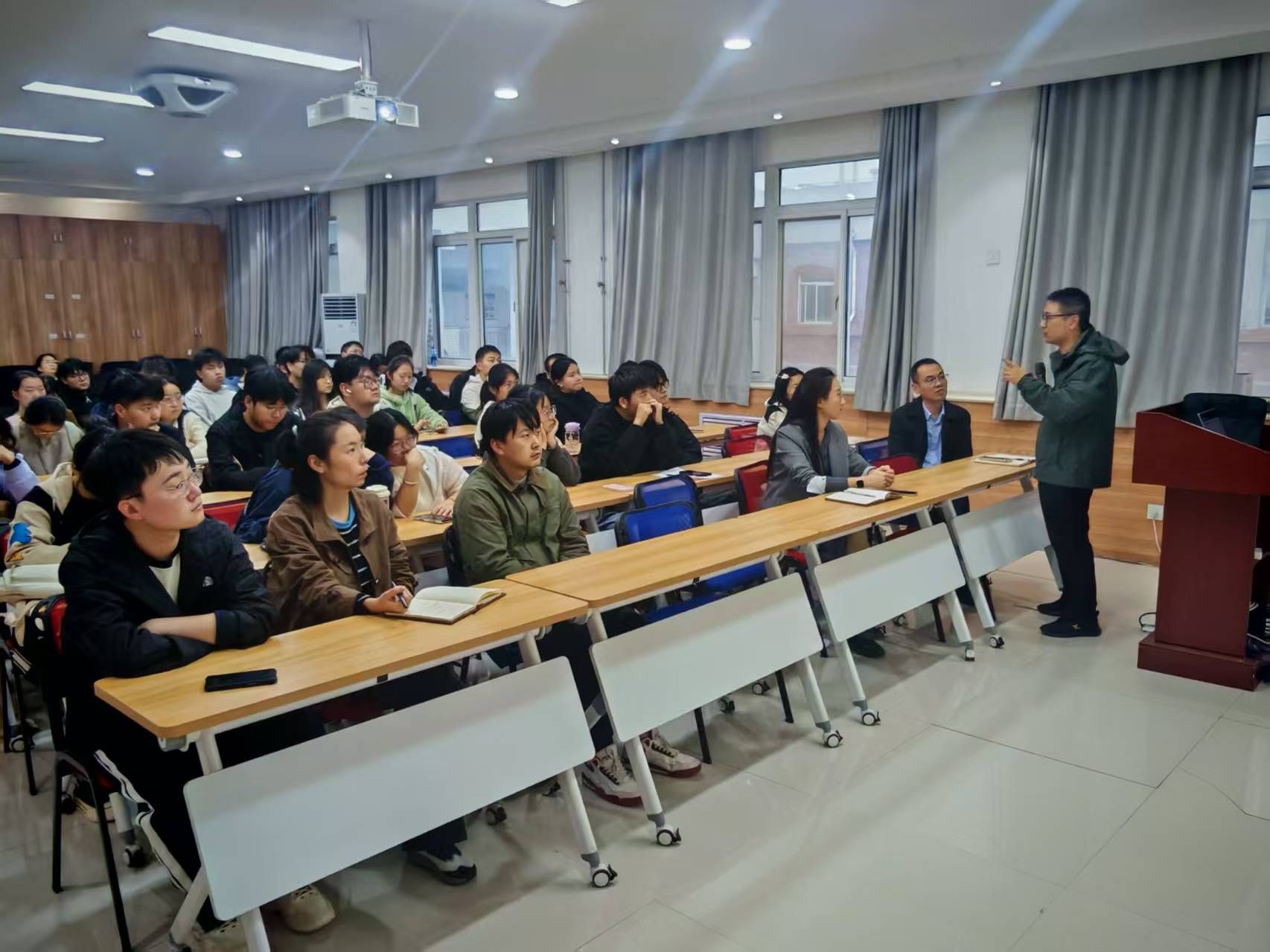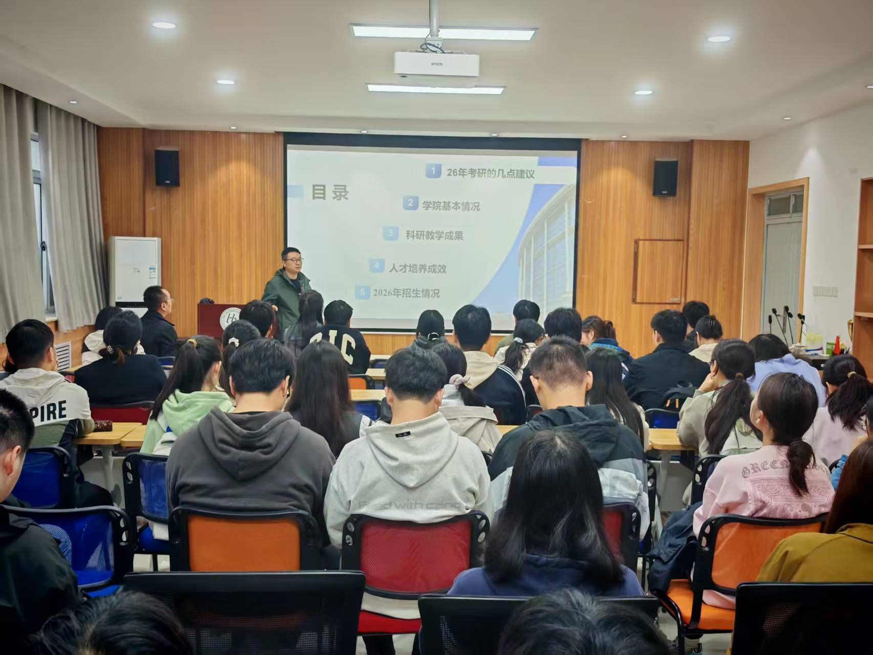 讲座尾声,学院党委副书记林定武作总结发言。他引用了“仰望星空,脚踏实地”的箴言,勉励同学们既要怀揣远大理想,更要立足自身实际情况,客观评估个人能力,选择最适合自己的院校。他特别强调,考研复习“在精不在多”,关键在于吃透核心知识点,构建完整的知识体系,实现高效备考。