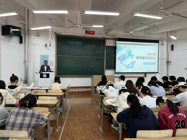 于4月23日上午在B-137召开了2021级本科生学风建设动员大会。学院党委副书记林定武、21级辅导员刘婧、学院教务老师耿倩以及21级全体本科生参加了此次会议。