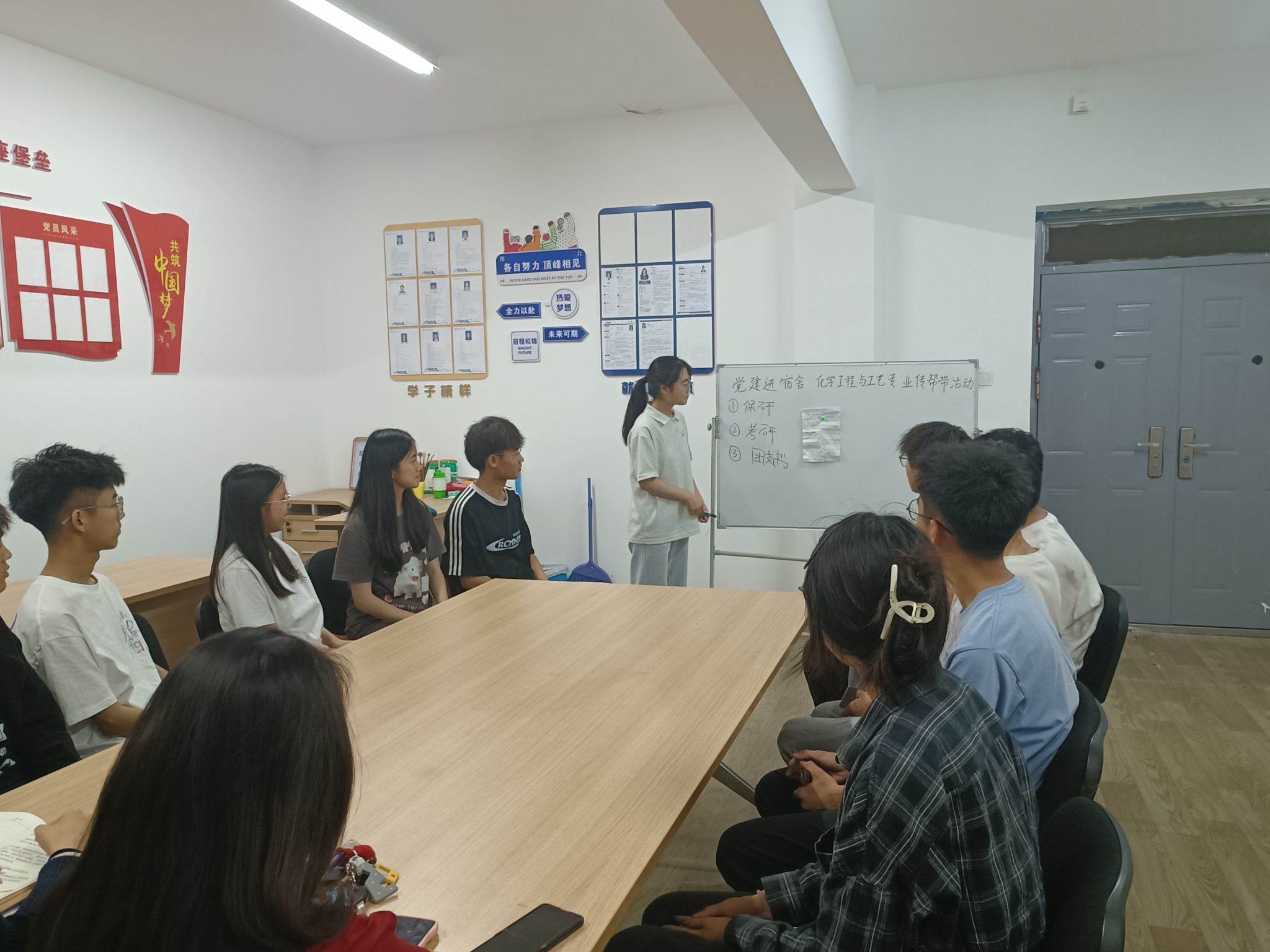 化学工程与工艺专业学生党支部于六号楼工作站开展“传帮带 促成长”主题党日活动。党支部书记盖潇宇主持,2020级学生党员代表和2023级全体入党积极分子参与。
