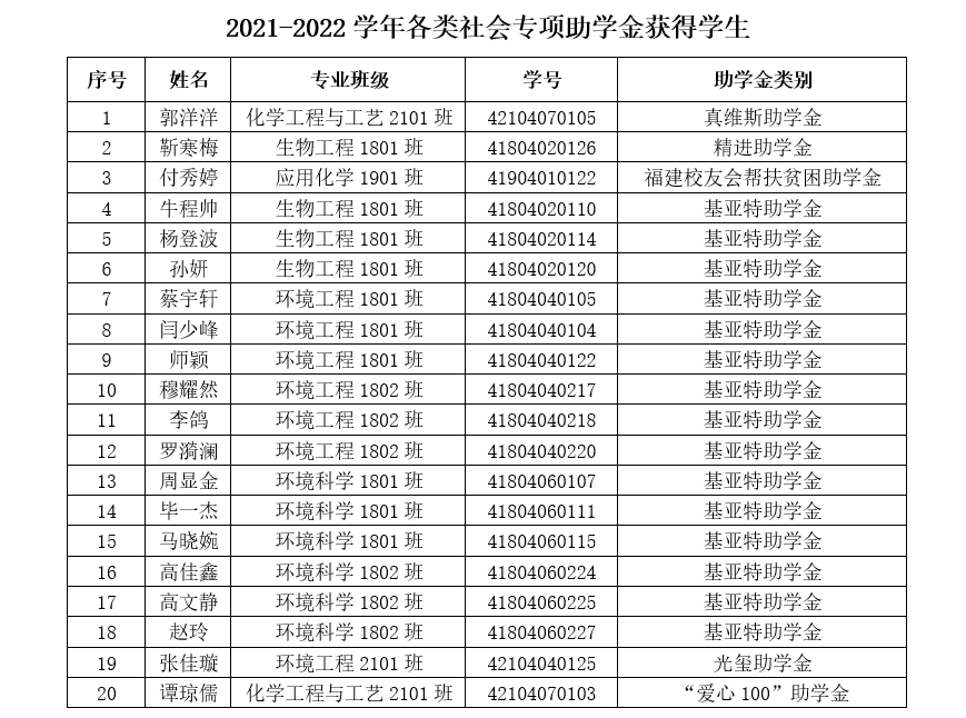 根据《关于开展2021-2022学年各类社会专项助学金评审工作的通知》相关要求,本着公平、公正、公开的原则,经学生申请,年级推荐等程序,经学院资助工作领导小组会议研究决定,拟推荐郭洋洋等20位同学为2021-2022学年各类社会专项助学金获得学生。具体名单见附件,公示时间3天(2021年11月8日-2021年11月10日)。