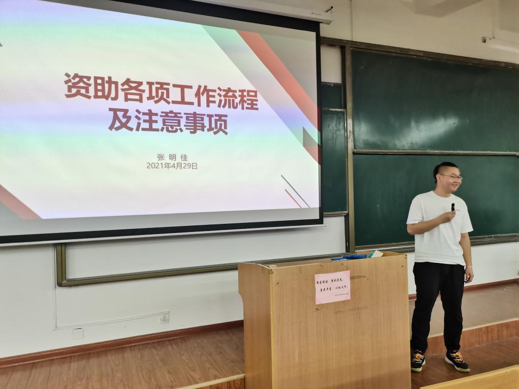 于B-133开展本次资助政策宣讲会。参加本次会议的有2018、2019级辅导员刘婧,2020级辅导员张易泽,学工办助理张明佳及20级全体同学。会议由刘婧主持。