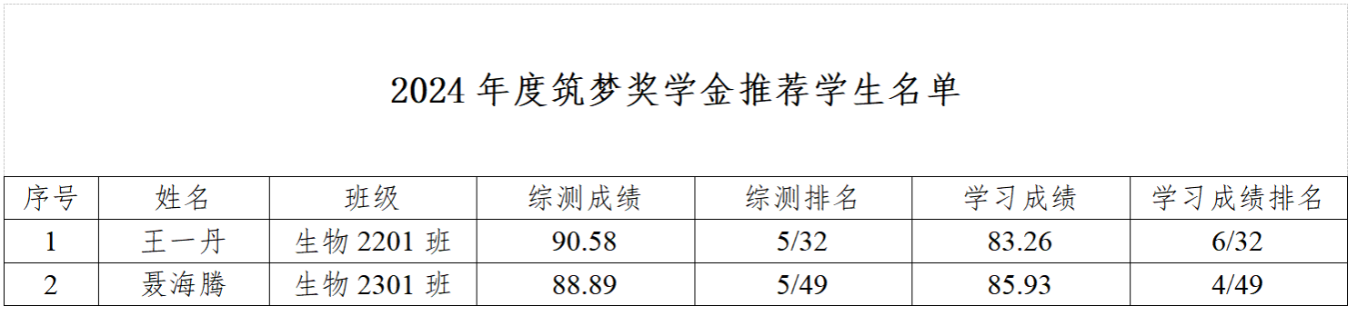 根据陕西省教育厅办公室《陕西省教育厅办公室关于做好2024年度“筑梦奖学金”项目评审工作的预通知》要求,本着公平、公正、公开的原则,经学生申请,年级推荐等程序,经学院资助工作领导小组会议研究决定,拟推荐王一丹、聂海腾两位同学为“筑梦奖学金”获奖学生。公示时间3个工作日(2024年11月6日-2024年11月8日)。