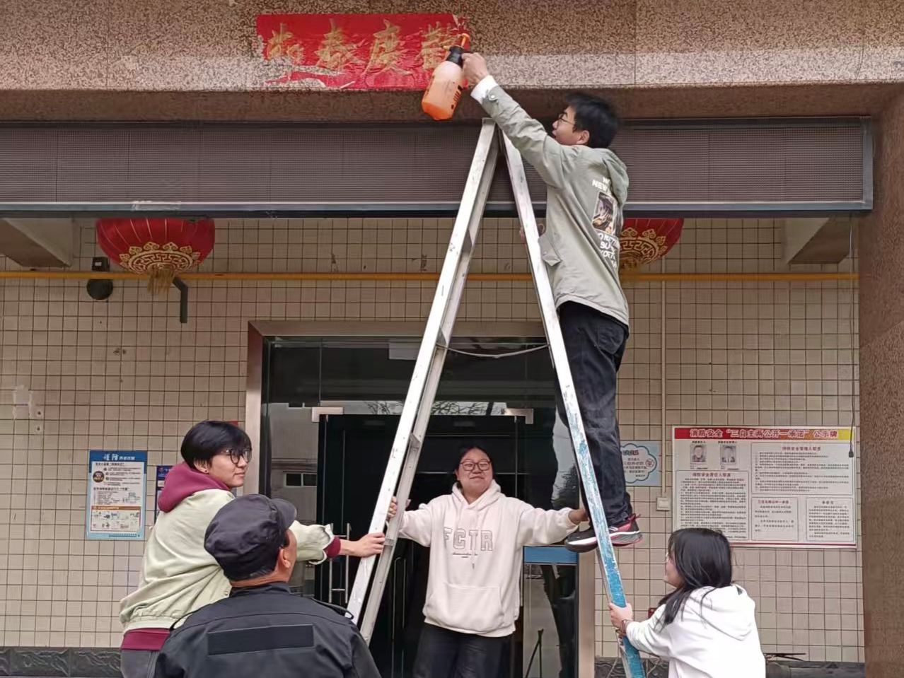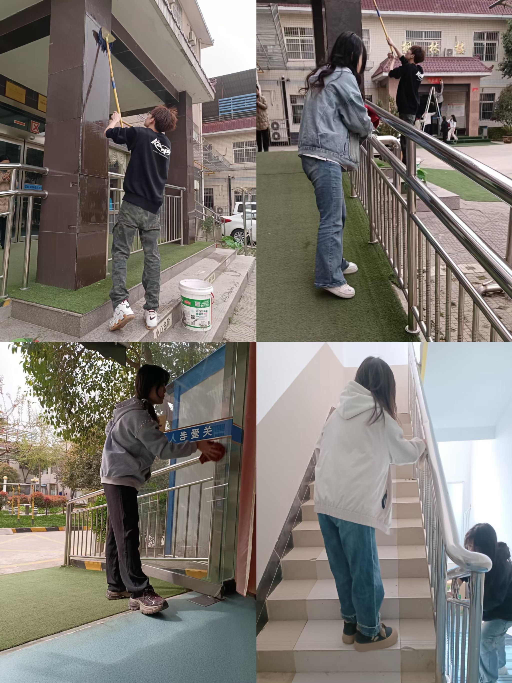 抵达养老院后,同学们立即投入环境清洁工作,手持清洁工具对庭院进行全方位打扫。从修剪灌木枝叶到清理步道积水,从擦拭玻璃门窗到整理公共区域,同学们以细致入微的劳动为老人打造整洁舒适的生活环境。