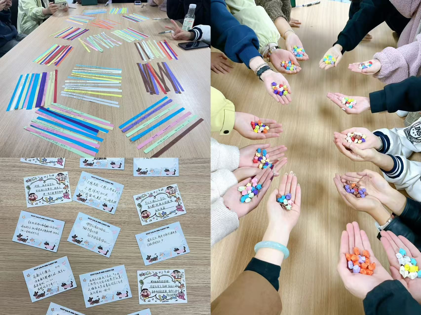 随后,活动进入“手写祝福,巧手成星”的环节。同学们在星星纸上认真写下能给予他人力量的语句,再将每一张纸条轻轻折叠成一颗颗饱含心意的星星。这些亲手制作的星星不仅是文字的载体,更是温暖的具象表达。