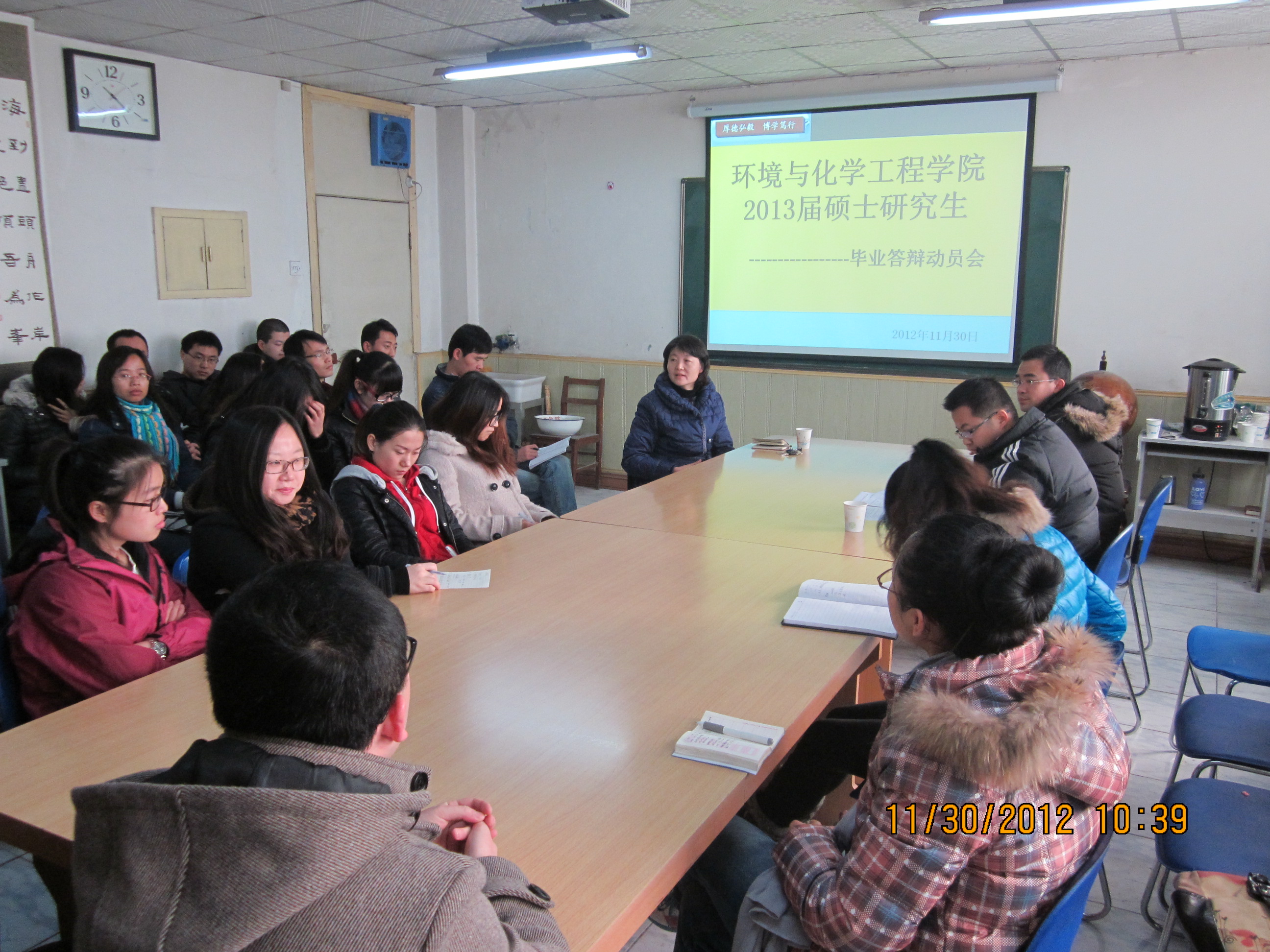 2013届硕士毕业生会议在院资料室召开。会议由2013届硕士生班主任李庆主持,院长狄育慧、院研究生秘书丁涛出席了会议。