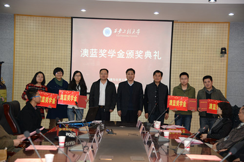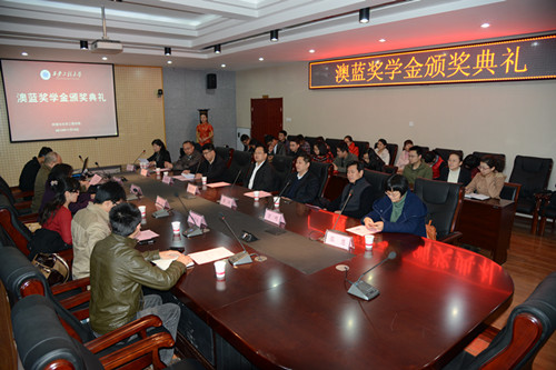 组织举办的“澳蓝”奖学金颁奖典礼在金花校区第三会议室举行。出席颁奖典礼的有澳蓝(福建)实业有限公司董事长黄华铃先生、我校副校长黄翔、研究生部主任万明、学生处副处长张慧、GimyTV
