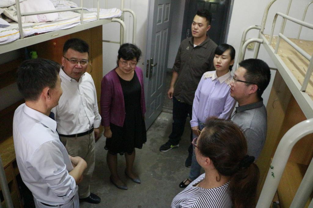 党委书记李建学带领全体学生工作办公室辅导员,走进学生公寓,探望刚入学的大一新生,并提醒新生们注意防火、防盗、防骗等宿舍安全问题。