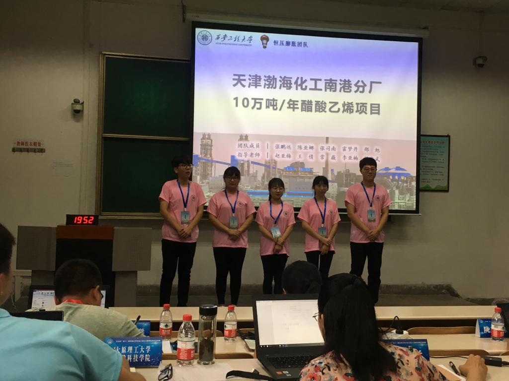 共有3支代表队参赛。其中,由2016级化学工程与工艺专业张鹏远、陈亚娜、张司南、霍梦丹、邵旭5名同学组成的“恒压膨胀”团队,在指导老师赵亚梅、常薇、王倩、李亚楠、林定武老师指导下,按照竞赛设计任务书的要求,完成作品“天津渤海化工南港分厂10万吨/年醋酸乙烯项目”。经过设计文档、工程图纸和现代设计方法应用三个专项评审和现场答辩的激烈比拼,从165项作品中脱颖而出,获得第十三届全国大学生化工设计竞赛西北赛区一等奖、全国二等奖。骞晓艺和杨沛为队长的其他两支队伍分别获得全国三等奖、参赛成功奖。