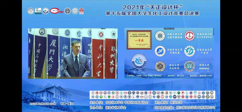 学生温向宇、陈晓乾、王瑞峰、韩娜、钟雨心组成的“天赋异禀的醇”参赛队,在2021年8月2日至8月3日参加了由石河子大学承办的西北赛区决赛,获得西北赛区特等奖和现代设计方法应用专项三等奖,并与西北大学、中北大学等高校代表西北赛区参加全国总决赛。在全国总决赛中,面对与天津大学、浙江大学、北京化工大学等化工强校的同台竞技,我校学子不畏强敌、团结一致、沉着应对,以工艺创新、绿色低碳、安全环保、经济可行的特色设计和精彩的汇报展示与答辩,得到专家评委的一致认可并荣获一等奖。