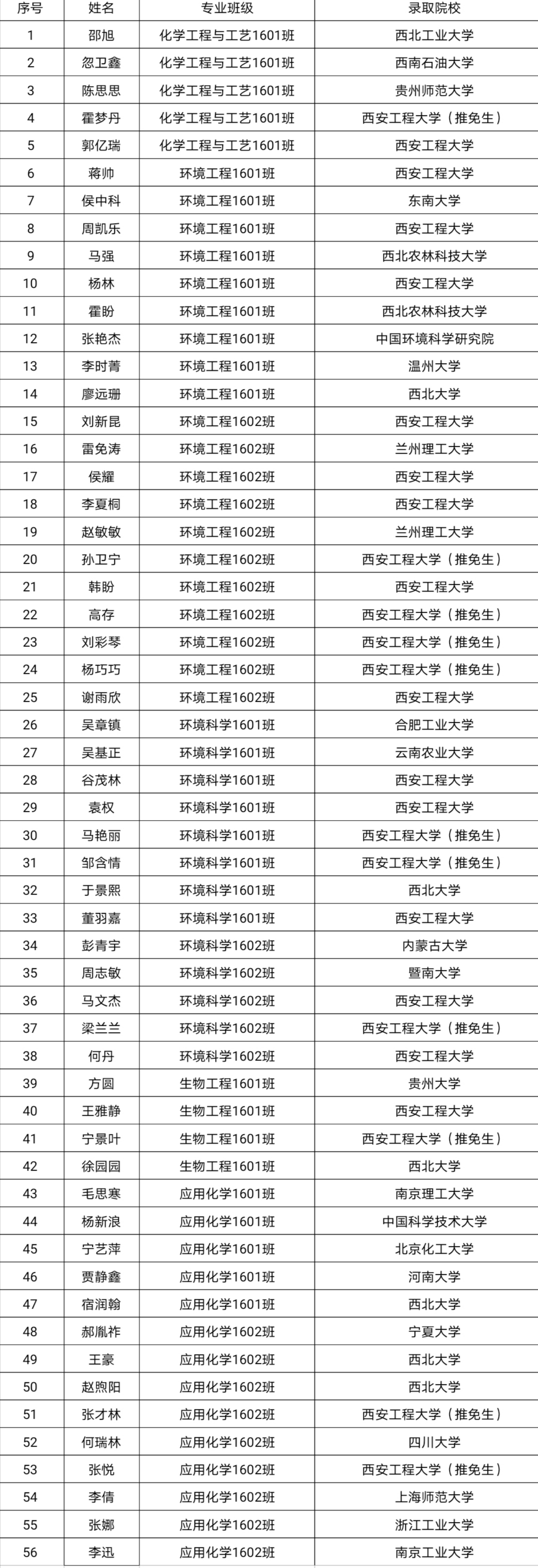 再传考研捷报。今年共有56人考取研究生,考研录取率达24.56%,其中环境工程专业升学20人,录取率32.25%;应用化学专业升学14人,录取率25.45%;环境科学专业升学13人,录取率23.63%;化学工程与工艺专业升学5人,录取率19.23%;生物工程专业升学4人,录取率13.33%。录取院校包括中国科学技术大学、东南大学、四川大学、西北工业大学、中国环境科学研究院、暨南大学、西北大学、GimyTV