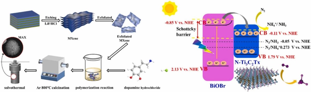 由于NH3的强N≡N键能、高电离能和较差的质子亲和力,在温和条件下合成NH3仍然是一个重大挑战。本研究采用盐酸多巴胺在Ti3C2Tx MXene表面进行原位聚合,随后,采用溶剂热法使N掺杂在Ti3C2Tx MXene表面原位诱导生长,制备了高比表面积、高折叠度的N-Ti3C2Tx MXene/BiOBr异质结。结果表明,BiOBr均匀地分散在N-Ti3C2Tx MXene表面。光催化氨产出率为270.73 μmol /g·h,是单独BiOBr的3.27倍,连续5次循环后仍能保持60%左右的产析出率。光催化机制是N-Ti3C2Tx MXene纳米片的高度分散和高导带电位促进电荷转移到纳米片的活性位点。本研究证明了盐酸多巴胺在太阳能利用MXene光催化材料中的潜在应用,此外,前期研究中在光催化NH3生产中,Bi4O5Br2锚定在具有欧姆异质结的Ti3C2MXene上,通过实验和理论计算相结合解析了光催化合成氨的机制(Journal of Colloid and Interface Science.2021,SCI一区, IF=9.965, Top期刊,GimyTV