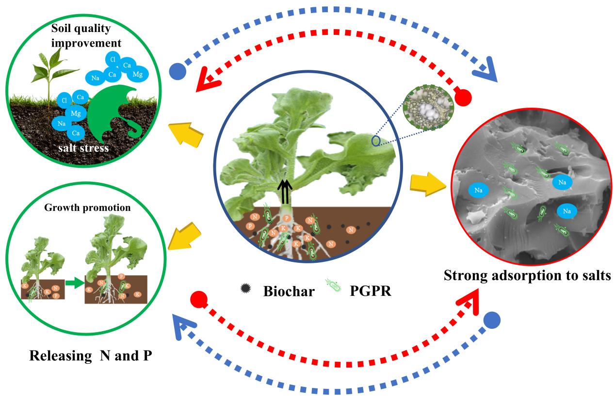 土壤盐渍化已成为阻碍农业生产发展和提高土地利用效率的关键因素。习近平总书记多次强调加强盐碱地综合治理是保障国家18亿亩耕地红线,因此开展盐碱地改良是国家重大战略需求。目前,生物措施被认为是一种有效的改良盐碱地的方法。通过在土壤中施加植物根际促生菌(PGPR)可以很大程度上缓解高盐浓度对植物的毒害作用,提高植物抗盐胁迫的能力。研究表明生物炭基菌剂对植物生长也有显著的促进作用,但由于原始生物炭缺乏或存在少量的金属阳离子,不能将盐碱土中的Na+完全置换,因此对盐碱地的改良效果仍有待提高。本研究将苹果木与Ca3(PO4)2和MgO共热解,并负载霍氏肠杆菌Wu15,成功制备了改性生物炭基菌剂。结果表明,与对照组相比,BC-Wu15中的土壤有机质和有效磷分别提高了320%和182%。此外,由于胞外聚合物的耐盐性和改性生物炭基菌剂的离子交换性能,BC-Wu15还显著促进了冰菜的生长。本研究为改良盐碱地和促进农业可持续发展提供了一种有效的策略。