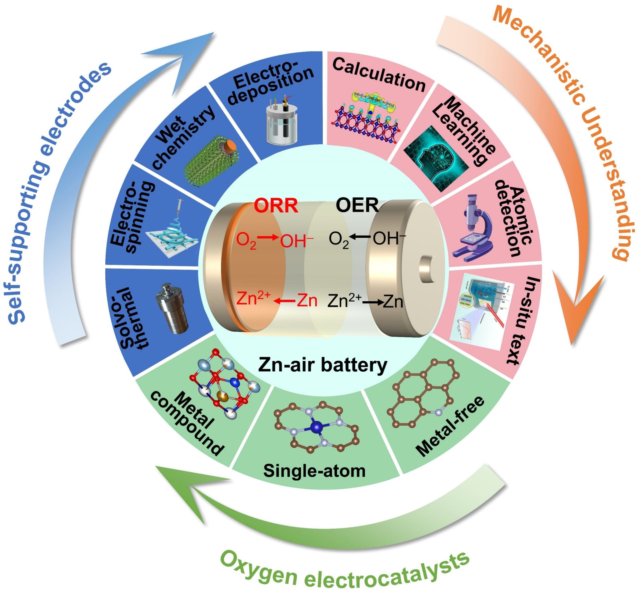 该文章首先从无金属催化剂,金属位点原子级分散的催化剂,过渡金属化合物三个方面总结了近年来关于ZABs中电催化剂结构设计的研究进展。再从膜电极的层面出发阐述了自支撑电极的构筑策略,并且深入探讨了如何通过合理的结构设计来提高电催化剂的催化活性和稳定性,并详细分析了不同合成策略对电催化剂性能的影响。同时通过理论计算,数据驱动的机器学习,原子尺度表征以及原位运行和表征四个方面出发对目前理解空气电极机理的方法进行了总结归纳。最后,基于当前的研究成果,我们还对ZABs未来的发展方向给出了建议。我们相信,这篇综述将为ZABs中的材料设计和界面工程提供有益的参考和启示,并期待为推动该领域的持续发展做出贡献。