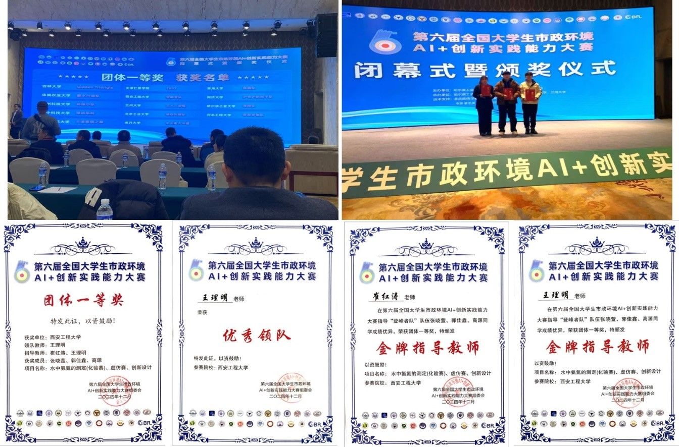 大赛分为校级预选赛、地区选拔赛及决赛三个阶段。校级预选赛考核内容包括“化学实验室风险评估与应急应变虚拟仿真”和“气相色谱仪仿真”两部分。环境工程专业教师崔红涛、王理明、高敏、周育红、刘钊和于翔组织与指导27位本科生参加预选赛。根据预选赛成绩,崔红涛等老师组建5支参赛队伍共计15名学生参加地区选拔赛。选拔赛包括化验赛和虚拟仿真赛两部分,化验赛为《水中氨氮的测定》,虚拟仿真赛包括氨氮测定虚拟仿真软件、《智能水厂运行与调控虚拟仿真软件》以及《工业级工具型污水处理仿真模拟软件》。参赛学生利用课余时间反复练习、规范实验操作,积极投入到虚仿软件的练习中。经过激烈角逐,参赛学生共获奖22项,同时“登峰者队”晋级决赛。登峰者队历时一个多半月,高质量完成调研报告和“面向未来的城市污水处理厂”的设计任务,经初评及复评进入线下答辩环节。在12月28日的答辩现场,登峰者队以“面向未来的西安市临潼区污水处理厂创意设计”为题做汇报展示,队员们认真、自信地回答评审专家的问题,最终取得“团体一等奖”的优异成绩。同时王理明老师获得“优秀领队”称号,崔红涛、王理明老师获得“金牌指导教师”称号。