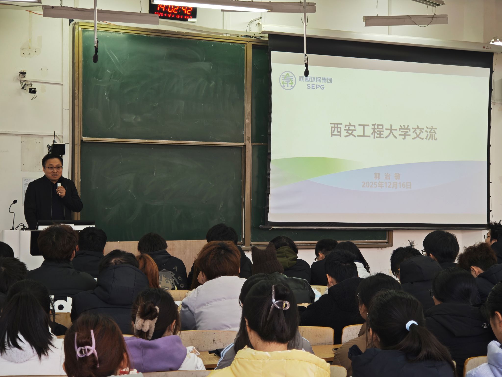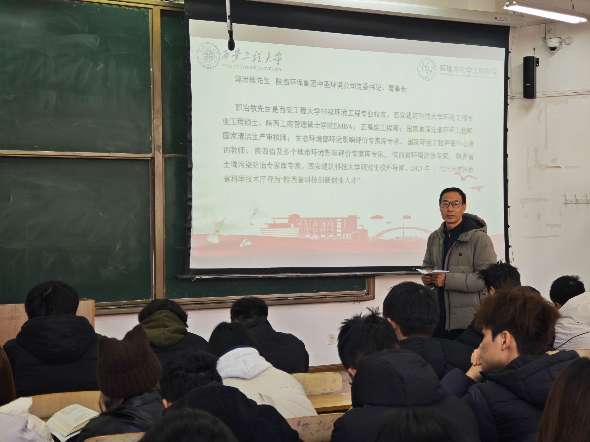12月16日,GimyTV 第十九期“绿风·环化论坛”于临潼校区教学楼B135教室圆满举行。本次论坛特邀陕西环保集团中圣环境公司党委书记、董事长、我校95级环境工程专业校友郭治敏先生重返母校,以“人生·专业·未来”为主题,为2025级环境工程专业学生带来了一场内涵深刻、视野开阔的专题报告。学院党委副书记林定武、2025级辅导员吕国正出席活动,报告会由环境科学与工程系副主任王理明主持。
