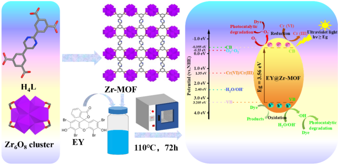 在印染废水深度处理方面,课题组构建了全新Zr-MOF及EY@Zr-MOF,实现了对水中Cr(VI)及多种活性染料的高效物理捕获与光化学降解。该材料对Cr(VI)的光还原效率高,对RB13、RR2和RR11的降解效果显著,反应动力学较Zr-MOF明显提升。研究成果以“Assembly of Eosin Y in-situ intercalated Zr-MOF composite for decontaminating Cr(VI) and reactive dyes via physical capture and photochemical purification”为题发表于《Journal of Molecular Structure》(中科院SCI二区)。化学工程与技术2022级研究生秦颖彤为论文第一作者,李庆和朱炜老师为通讯作者,GimyTV