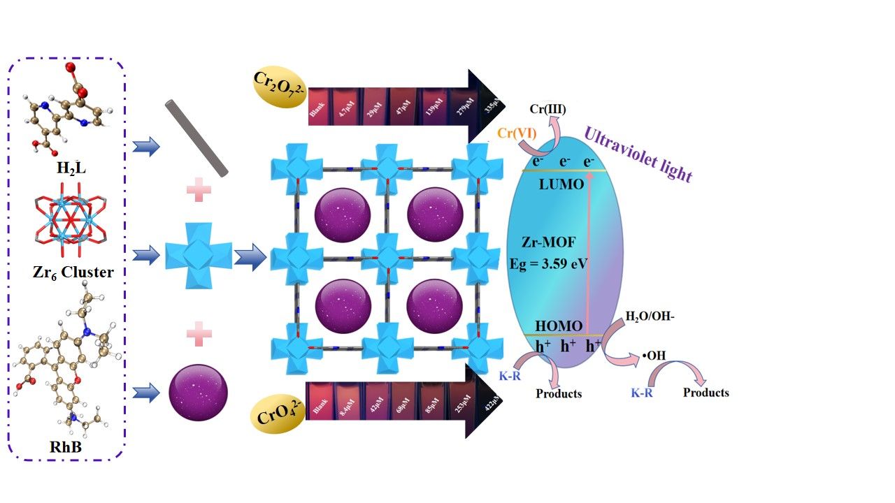 在荧光传感材料设计方面,课题组构建了新型双发射比率型荧光探针RhB@Zr-MOF,实现对Cr(VI)的高灵敏、高选择性检测。RhB分子有效抑制了聚集诱导猝灭,DFT计算证实材料荧光源于RhB分子的光致电子转移过程。此外,该材料还兼具对Cr(VI)的光还原及对活性染料的光催化降解能力。研究成果以“RhB intercalated Zr(VI)-bipyridine architecture for efficient ratiometric fluorescent response toward Cr(VI) analyte and decontamination of Cr(VI) and reactive dye via photochemical REDOX”为题发表于国际期刊《Journal of Molecular Structure》(中科院SCI二区)。化学工程与技术专业2022级研究生刘洁为论文第一作者,李庆和朱炜老师为通讯作者,GimyTV