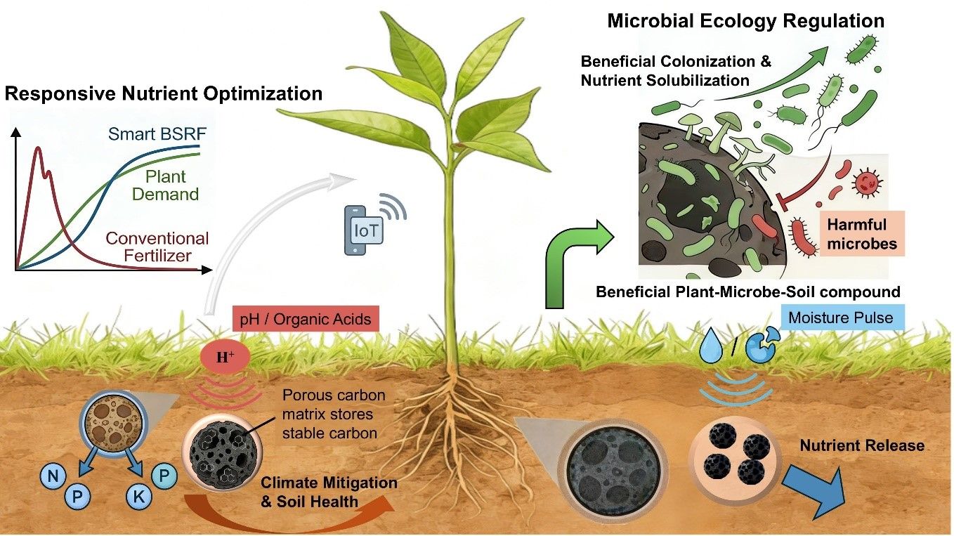 在多维功能解析,构建智能肥料研发理论框架方面,为系统梳理生物炭基缓释肥料的发展脉络与未来方向,课题组撰写综述论文,从环境响应智能调控、闭环养分循环、碳肥协同作用及根际微调控四个维度,系统阐述了该领域的核心进展。论文深入分析了生物炭载体的结构−性能关系,总结了物理屏障、化学作用、离子交换等释肥机制,探讨了pH、水分、温度响应型智能肥料的设计思路。综述指出,生物炭基缓释肥料已从单纯的养分载体向土壤−植物系统的智能调控剂演进,通过AI驱动的配方优化和工艺设计,可实现养分释放与作物需求的精准匹配。同时,论文明确了当前存在的智能化水平不足、田间验证不充分等挑战,为后续研究提供了清晰的技术路线图。研究成果以“Preparation of biochar slow-release phosphate fertilizer granules with starch-CMC-Na binder: improving granule mechanical and slow-release properties”为题发表于国际期刊《Journal of Environmental Chemical Engineering》(SCI二区,IF=7.2),化学与工程技术专业2023级联培博士梁鹏为第一作者,武占省和田飞老师为通讯作者,GimyTV 为第一通讯单位。