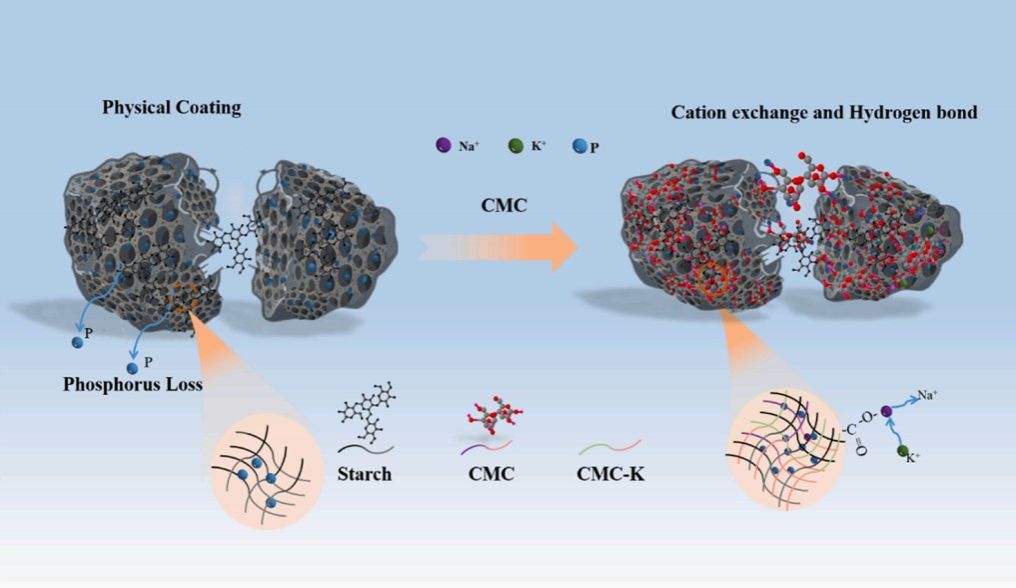 在创新复合粘结剂技术,提升肥料机械性能与缓释效果方面,课题组以羧甲基纤维素钠(CMC-Na)和淀粉为复合粘结剂,通过挤压造粒工艺制备了新型生物炭基缓释磷肥颗粒(BSRPF)。该研究创新性地利用两种天然高分子材料的协同交联作用,解决了单一粘结剂存在的机械强度不足、耐水性差等问题,为规模化农业应用奠定了基础。研究成果以“Preparation of biochar slow-release phosphate fertilizer granules with starch-CMC-Na binder: improving granule mechanical and slow-release properties”为题发表于国际期刊《Journal of Environmental Chemical Engineering》(SCI二区,IF=7.2),环境科学与工程专业2023级研究生陈梦真为第一作者,武占省老师为通讯作者,GimyTV 为唯一通讯单位。